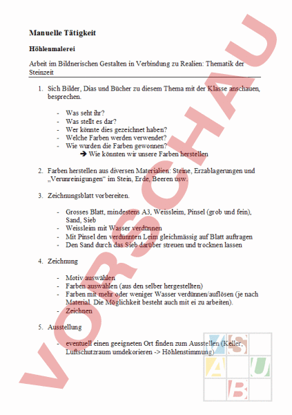 Manuelle Tätigkeit Höhlenmalerei Arbeit im Bildnerischen Gestalten in Verbindung zu Realien: Thematik der Steinzeit 1. Sich Bilder, Dias und Bücher zu diesem Thema mit der Klasse anschauen, besprechen. Was seht ihr? Was stellt es dar? Wer könnte dies gezeichnet haben? Welche Farben werden verwendet? Wie wurden die Farben gewonnen? Wie könnten wir unsere Farben herstellen 2. Farben herstellen aus diversen Materialien: Steine, Erzablagerungen und „Verunreinigungen im Stein, Erde, Beeren usw. 3. Zeichnungsblatt vorbereiten. Grosses Blatt, mindestens A3, Weissleim, Pinsel (grob und fein), Sand, Sieb Weissleim mit Wasser verdünnen Mit Pinsel den verdünnten Leim gleichmässig auf Blatt auftragen Den Sand durch das Sieb darüber streuen und trocknen lassen 4. Zeichnung Motiv auswählen Farben auswählen (aus den selber hergestellten) Farben mit mehr oder weniger Wasser verdünnen/auflösen (je nach Material. Die Möglichkeit besteht auch mit ei zu arbeiten). Zeichnen 5. Ausstellung eventuell einen geeigneten Ort finden zum Ausstellen (Keller, Luftschutzraum umdekorieren - Höhlenstimmung)