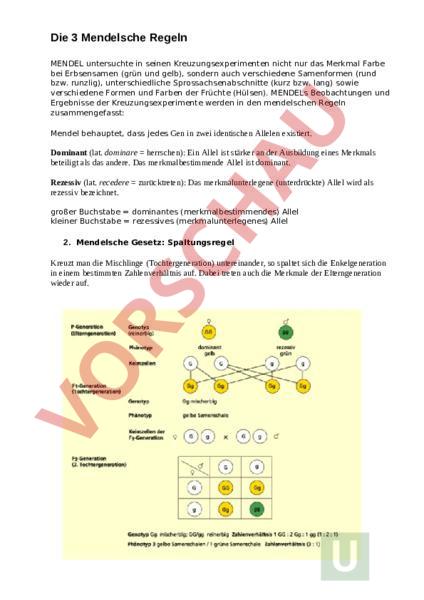 Die 3 Mendelsche Regeln MENDEL untersuchte in seinen Kreuzungsexperimenten nicht nur das Merkmal Farbe bei Erbsensamen (grün und gelb), sondern auch verschiedene Samenformen (rund bzw. runzlig), unterschiedliche Sprossachsenabschnitte (kurz bzw. lang) sowie verschiedene Formen und Farben der Früchte (Hülsen). MENDELs Beobachtungen und Ergebnisse der Kreuzungsexperimente werden in den mendelschen Regeln zusammengefasst: Mendel behauptet, dass jedes Gen in zwei identischen Allelen existiert. Dominant (lat. dominare herrschen): Ein Allel ist stärker an der Ausbildung eines Merkmals beteiligt als das andere. Das merkmalbestimmende Allel ist dominant. Rezessiv (lat. recedere zurücktreten): Das merkmalunterlegene (unterdrückte) Allel wird als rezessiv bezeichnet. großer Buchstabe dominantes (merkmalbestimmendes) Allel kleiner Buchstabe rezessives (merkmalunterlegenes) Allel 2. Mendelsche Gesetz: Spaltungsregel Kreuzt man die Mischlinge (Tochtergeneration) untereinander, so spaltet sich die Enkelgeneration in einem bestimmten Zahlenverhältnis auf. Dabei treten auch die Merkmale der Elterngeneration wieder auf. 3. Menschelsche Regel: Das Kombinationsgesetz Kreuzt man zwei Rassen, die sich in mehreren Merkmalen unterscheiden, so werden die einzelnen Erbanlagen unabhängig voneinander vererbt. Diese Erbanlagen können sich neu kombinieren.