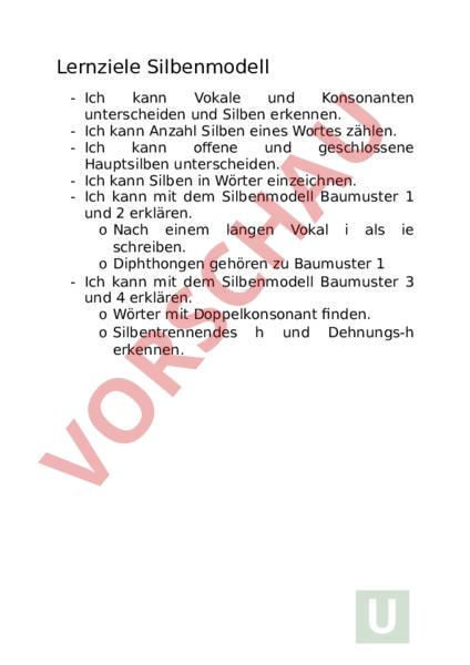 Lernziele Silbenmodell Ich kann Vokale und Konsonanten unterscheiden und Silben erkennen. Ich kann Anzahl Silben eines Wortes zählen. Ich kann offene und geschlossene Hauptsilben unterscheiden. Ich kann Silben in Wörter einzeichnen. Ich kann mit dem Silbenmodell Baumuster 1 und 2 erklären. Nach einem langen Vokal als ie schreiben. Diphthongen gehören zu Baumuster 1 Ich kann mit dem Silbenmodell Baumuster 3 und 4 erklären. Wörter mit Doppelkonsonant finden. Silbentrennendes und Dehnungs-h erkennen.