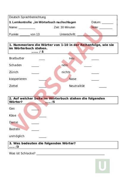 Deutsch Sprachbetrachtung 3. Lernkontrolle: „im Wörterbuch nachschlagen Datum: Name: Note: Zeit: 30 Minuten Punkte: von 13 Unterschrift: 1. Nummeriere die Wörter von 1-10 in der Reihenfolge, wie sie im Wörterbuch stehen. 5 Bratbutter neu Schaden nein Zürich nichts kooperieren Nase Zottel Neutralität 2. Auf welcher Seite im Wörterbuch stehen die folgenden Wörter? . /5 Gas Käse Dame Basteln unmöglich 3. Was bedeuten die folgenden Wörter? . /3 Was ist Schlacke? Was ist ein Judoka? Was ist ein Tribun?