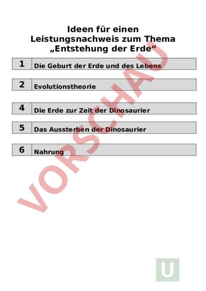 Ideen für einen Leistungsnachweis zum Thema „Entstehung der Erde 1 Die Geburt der Erde und des Lebens 2 Evolutionstheorie 4 Die Erde zur Zeit der Dinosaurier 5 Das Aussterben der Dinosaurier 6 Nahrung