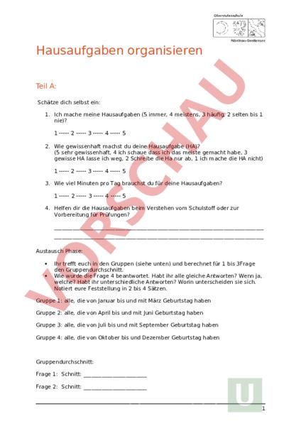Hausaufgaben organisieren Teil A: Schätze dich selbst ein: 1. Ich mache meine Hausaufgaben (5 immer, 4 meistens, 3 häufig, 2 selten bis 1 nie)? 1 ----- 2 ----- 3 ----- 4 ----- 5 2. Wie gewissenhaft machst du deine Hausaufgabe (HA)? (5 sehr gewissenhaft, 4 ich schaue dass ich das meiste gemacht habe, 3 gewisse HA lasse ich weg, 2 Schreibe die Ha nur ab, 1 ich mache die HA nicht) 1 ----- 2 ----- 3 ----- 4 ----- 5 3. Wie viel Minuten pro Tag brauchst du für deine Hausaufgaben? 1 ----- 2 ----- 3 ----- 4 ----- 5 4. Helfen dir die Hausaufgaben beim Verstehen vom Schulstoff oder zur Vorbereitung für Prüfungen? Austausch Phase: Ihr trefft euch in den Gruppen (siehe unten) und berechnet für 1 bis 3Frage den Gruppendurchschnitt. Wie wurde die Frage 4 beantwortet. Habt ihr alle gleiche Antworten? Wenn ja, welche? Habt ihr unterschiedliche Antworten? Worin unterscheiden sie sich. Notiert eure Feststellung in 2 bis 4 Sätzen. Gruppe 1: alle, die von Januar bis und mit März Geburtstag haben Gruppe 2: alle, die von April bis und mit Juni Geburtstag haben Gruppe 3: alle, die von Juli bis und mit September Geburtstag haben Gruppe 4: alle, die von Oktober bis und Dezember Geburtstag haben Gruppendurchschnitt: Frage 1: Schnitt: Frage 2: Schnitt: 1 Frage 3: Schnitt: Frage 4 Teil Nimm dir nun 10 Minuten Zeit und beantworte folgende Fragen möglichst genau. Beschreibe die Situationen in Sätzen: Ort: Wo machst du deine Hausaufgaben? In deinem Zimmer, am Esstisch? Wie sieht der Ort dieser Ort aus? Hast du Platz oder nicht? Beschreibe. Hast du alle nötigen Unterlagen griffbereit, um deine Hausaufgaben zu machen? Zeit: Wann machst du die Hausaufgaben? Hast du die Hausaufgaben schön ein geplant oder machst du sie im letzten Moment? 2 Störfaktoren: Welche Störfaktoren lenken dich von den Hausaufgaben ab? Wo ist dein Handy in der Zeit, wo du Hausaufgaben machst? Ist es an- oder abgestellt? Gibt es Apps, die dich ablenken? Plan: Wie planst du deine Hausaufgaben? Machst du dir einen Wochenplan? Beschreibe in ein paar Sätzen. 3 Du wirst nun von einer Lehrperson mit einem anderen Mitschüler eingeteilt. Euer Auftrag: Gestaltet eine Powerpoint (Umfang 2 bis 3 slides). Darauf fasst ihr 1. Eure Situation gemäss den Fragen von oben zusammen. 2. Nennt entweder eine Gemeinsamkeit oder ein Unterschied bezüglich Hausaufgaben Eure Powerpoint müsst ihr eventuell der Klasse vorstellen. Teil C: In der Klasse: Sammelt nun Punkte, die ein erfolgreiches Lösen der Hausaufgaben fördern. Jeder schreibt 2 bis 3 Sachen auf bereitgelegte Zettel. Diskutiert im Klassenverband, was sind gute bzw. weniger gute Vorausaussetzungen, um erfolgreich Hausaufgaben zu machen. Teil D: Überlege nun für die kommende Woche einen Punkt, du bezüglich deiner Hausaufgaben- Gestaltung ändern möchtest. Wie lautet dieser Punkt: Führe nun ein Tagebuch: Beantworte folgende Fragen Wie ist es dir Tag für Tag mit dem geänderten Punkt gegangen? Konntest du die Änderung jeden Tag umsetzen? Welche Fortschritte siehts du? Tagebuch 4 Montag Diensttag Mittwoch Donnerstag 5 Freitag Montag 6