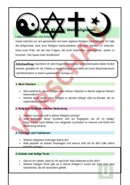 RKE – 5. Klasse: Weltreligionen Liebe Schülerinnen und Schüler, heute möchten wir uns gemeinsam mit eurer eigenen Religion beschäftigen. Ihr habt die Möglichkeit, über eure Religion nachzudenken und mehr darüber zu erfahren. Nutzt euer iPad, um bei den Fragen, die euch besonders interessieren, weiter zu forschen. Viel Spass beim Entdecken! Arbeitsauftrag: Nachdem ihr alle Fragen beantworten und interessante Bilder finden konntet, gestaltet ihr ein Plakat zu eurer Religion und stellt sie euren Mitschülerinnen und Mitschülern in einem spannenden Vortrag vor. 1. Mein Glauben Wie würdest du deine Religion oder deinen Glauben in deinen eigenen Worten beschreiben? Welche Rolle spielt deine Religion in deinem Alltag? Gibt es Rituale, die du regelmässig machst? 2. Religiöse Symbole und ihre Bedeutung Welche Symbole sind in deiner Religion wichtig? Was bedeuten diese Symbole und wo begegnen sie dir im Alltag? (Tipp: Suche nach Bildern von religiösen Symbolen im Internet und finde ihre Bedeutung heraus) 3. Feiertage und Traditionen Welche religiösen Feiertage feierst du? Was passiert an diesen Feiertagen und warum sind sie für dich oder deine Familie wichtig? 4. Gebete und heilige Texte Gibt es ein Gebet, dass du oft sprichst? Was bedeutet es für dich? Welche heiligen Texte gibt es in deiner Religion? Suche ein Zitat oder eine Geschichte, die dir besonders gefällt. 5. Gemeinschaft und Zusammenhalt In welchem Rahmen lebst du deinen Glauben mit anderen Menschen? (z.B. Kirche, Moschee, Synagoge) Was gefällt dir besonders an dieser Gemeinschaft? Welche Aktivitäten gibt es dort? 6. Fragen und Gedanken Gibt es Fragen zu deiner Religion, die du schon immer stellen wolltest? Gibt es etwas, das du gerne genauer verstehen würdest? Recherchiere mit deinem iPad und teile deine Entdeckungen mit uns. Extra-Aufgabe: Religions-Quiz Erstelle ein kleines Quiz über deine Religion mit mindestens fünf Fragen. Die Antworten kannst du im Internet recherchieren oder aus deinem eigenen Wissen erstellen. Schreibe deine Quiz Fragen auf ein Extrablatt und gestalte es bunt oder mit Bildern. Ich freue mich darauf, mit euch über eure Entdeckungen zu sprechen! Viel Erfolg und Freude beim Forschen!