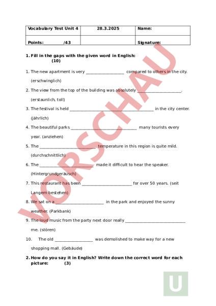 Vocabulary Test Unit 4 28.3.2025 Points:/43 Name: Signature: 1. Fill in the gaps with the given word in English: (10) 1. The new apartment is very compared to others in the city. (erschwinglich) 2. The view from the top of the building was absolutely . (erstaunlich, toll) 3. The festival is held in the city center. (jährlich) 4. The beautiful parks many tourists every year. (anziehen) 5. The temperature in this region is quite mild. (durchschnittlich) 6. The made it difficult to hear the speaker. (Hintergrundgeräusch) 7. This restaurant has been for over 50 years. (seit Langem bestehen) 8. We sat on in the park and enjoyed the sunny weather. (Parkbank) 9. The loud music from the party next door really me. (stören) 10. The old was demolished to make way for new shopping mall. (Gebäude) 2. How do you say it in English? Write down the correct word for each picture: (3) 3. Fill in the gaps with the correct word (11) holiday landmark height immigrant lift liberty harbour inspiring ground floor hail gritty Last summer, went on 1 to new city. The city was very interesting but the area where we stayed was very 2 , but it had many interesting places to visit. One day, we went to the 3 to see the boats. We also visited famous 4 that was very 5 . It was so tall that it made me feel dizzy! We stayed in hotel on the 6 , which was very convenient. One evening, there was big storm with 7 . It was scary, but we stayed safe inside. We met an 8 family who told us their story. It was very 9 to hear how they started new life. The next day, we took 10 to the top of tall building. From there, we could see the whole city, especially the statue of 11was very impressive. It was trip full of adventures. 4. Transform the Words: (v Verb noun Nomen, adj Adjektiv, adv Adverb) (8) EX: diverse (adj) noun: diversity destroy (v) noun: exception (n) adjective: excited (adj) noun: perform (v) noun: persuasion (n) unfortunate (adj) verb: adv: valuable (adj) noun: preference (n) verb: 5. Fill out the crossword: (10)