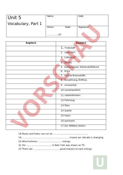 Unit 5 Name: Date: Vocabulary, Part 1 Points: Mark: Signature: ./22 Englisch Deutsch 1. Treibstoff 2. erreichen 3. Lebensstil 4. Benzin 5. Kohlendioxid, Kohlenstoffdioxid 6. Krise 7. Fossile Brennstoffe 8. Auswirkung, Einfluss 9. erneuerbar 10. verantwortlich 11. solarbetrieben 12. Fahrzeug 13. Stau 14. Quelle 15. lösen 16. wechseln 17. Der Mittlere Ostern 18. Buses and trains can run on 19. means our climate is changing. 20. Wind turbines energy. 21. His in New York was shown on TV. 22. There are good reasons to save energy.