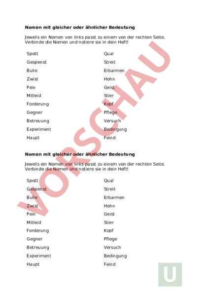 Nomen mit gleicher oder ähnlicher Bedeutung Jeweils ein Nomen von links passt zu einem von der rechten Seite. Verbinde die Nomen und notiere sie in dein Heft! Spott Qual Gespenst Streit Bulle Erbarmen Zwist Hohn Pein Geist Mitleid Stier Forderung Kopf Gegner Pflege Betreuung Versuch Experiment Bedingung Haupt Feind Nomen mit gleicher oder ähnlicher Bedeutung Jeweils ein Nomen von links passt zu einem von der rechten Seite. Verbinde die Nomen und notiere sie in dein Heft! Spott Qual Gespenst Streit Bulle Erbarmen Zwist Hohn Pein Geist Mitleid Stier Forderung Kopf Gegner Pflege Betreuung Versuch Experiment Bedingung Haupt Feind