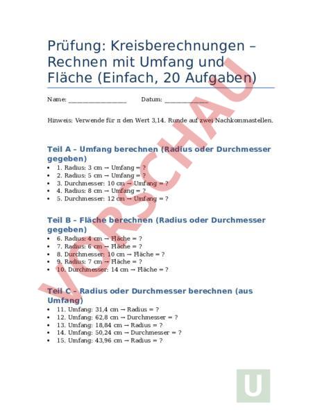 Arbeitsblatt: Prüfung Kreisberechnungen