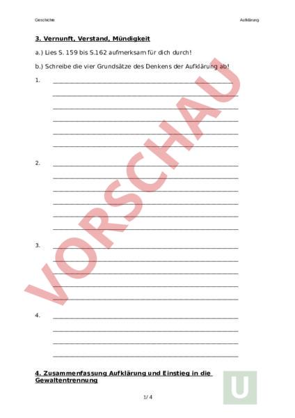 Geschichte Aufklärung 3. Vernunft, Verstand, Mündigkeit a.) Lies S. 159 bis S.162 aufmerksam für dich durch! b.) Schreibe die vier Grundsätze des Denkens der Aufklärung ab! 1. 2. 3. 4. 4. Zusammenfassung Aufklärung und Einstieg in die Gewaltentrennung 1/ 4 Geschichte Aufklärung Lies diesen Text durch bespreche die Lösung mit deinem Pultnachbarn Schiffbruch auf einer einsamen Insel Während eines heftigen Sturmes im Ozean läuft ein Kreuzfahrtschiff auf ein Riff auf und geht unter. Alle 156 Passagiere, die aus allen Teilen der Welt stammen, können mit viel Glück schwimmend eine einsame Insel erreichen. Die Insel hat eine Quelle, aus der ohne Pause Trinkwasser fließt, überall lassen sich essbare Früchte finden und Jagdtiere gibt es ebenfalls im Überfluss. Damit können die Menschen auf der Insel problemlos über Jahre hinweg überleben. Sie bauen sich Hütten und freunden sich mit der Umgebung an. Nachdem ein Jahr lang kein anderes Schiff auftaucht und das Meer um die Insel herum viel zu unruhig ist, um mit einem Floß oder selbstgebauten Schiff zu entkommen, geben sie die Hoffnung auf, gerettet zu werden. Das macht ihnen aber gar nicht so viel aus, da sie mittlerweile gerne auf der paradiesischen Insel leben. Der neu gegründete Inselstaat funktioniert zu Beginn ganz gut. Jeder ist glücklich und zufrieden. Einige gründen sogar neue Familien und bekommen Kinder. Selbstverständlich kommt es mit der Zeit allerdings auch zu Streitigkeiten, Neid und Habgier. Diebstähle und Gewalttätigkeiten stören immer mehr den friedlichen Alltag der Bewohner, da jeder sich so verhält, wie es ihm gerade in den Gram passt. Als die Zustände immer unerträglicher werden, treffen sich die gesamten Bewohner der Insel, um über die Lage zu beraten und eine Lösung zu finden. Findet in eurer Gruppe eine Lösung, wie man das Leben auf der Insel organisieren könnte, damit wieder alle im Frieden leben können. 6. Eine vernünftige Staatsordnung 2/ 4 Geschichte Aufklärung Die Aufgaben der drei Gewalten: Gewalt Gewalt Gewalt a.) Was würde ohne Gewaltentrennung passieren? b.) Welches sind nach der Meinung der Aufklärer die Grundrechte der Menschen? c.) Welche Grundrechte haben wir heute? d.) Wozu brauchen die Menschen Staaten? 3/ 4 Geschichte Aufklärung e.) Wie wirkten sich die Gedanken der Aufklärer für die absolute Monarchie aus? 4/ 4