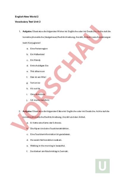 English New World 2 Vocabulary Test Unit 2 1. Aufgabe: Übersetze die folgenden Wörter ins Englische oder ins Deutsche. Achte auf die korrekte phonetische (lautgetreue) Rechtschreibung, Anzahl, Artikel sowie Anpassungen beim Konjugieren! a. Eine Ferienregion b. Ein Hallenbad c. Ein Handy d. Entschuldigen Sie e. This afternoon f. Das ist ein Witz! g. Tomorrow h. Its not far i. Give directions j. Ich wurde berühmt 2. Aufgabe: Übersetze die folgenden Sätze ins Englische oder ins Deutsche. Achte auf die korrekte phonetische Rechtschreibung, Anzahl und den Artikel. a. Er hatte eine Karte der Schweiz. b. Die Alpen sind eine Touristenattraktion. c. Eine Touristeninformation ist geradeaus. d. He wears fashionable sneakers. e. Walking in the morning is beautiful. f. Sie klettert am Nachmittag in Zermatt.
