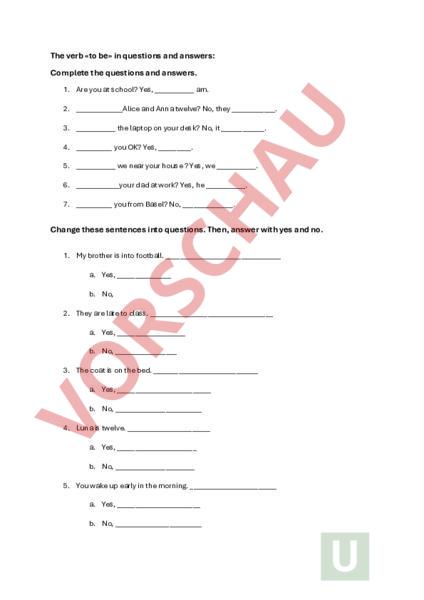 The verb «to be» in questions and answers: Complete the questions and answers. 1. Are you at school? Yes, am. 2.Alice and Anna twelve? No, they . 3. the laptop on your desk? No, it . 4. you OK? Yes,. 5. we near your house Yes, we. 6. your dad at work? Yes, he. 7. you from Basel? No, . Change these sentences into questions. Then, answer with yes and no. 1. My brother is into football. a. Yes, b. No, 2. They are late to class. a. Yes, b. No, 3. The coat is on the bed. a. Yes, b. No, 4. Luna is twelve. a. Yes, b. No, 5. You wake up early in the morning. a. Yes, b. No,