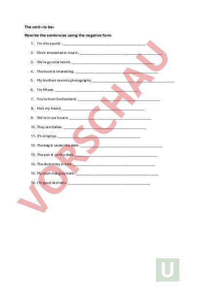 The verb «to be» Rewrite the sentences using the negative form 1. Im into sports 2. Shes interested in music. 3. Were good at tennis. 4. The book is interesting. 5. My brothers are into photography. 6. Im fifteen. 7. Youre from Switzerland. 8. Hes my friend. 9. Were in our house. 10. They are Italian. 11. Its laptop. 12. The bag is under the desk. 13. The pen is on the desk. 14. The dictionary is new. 15. My mum has grey hairs. 16. Im good at music.