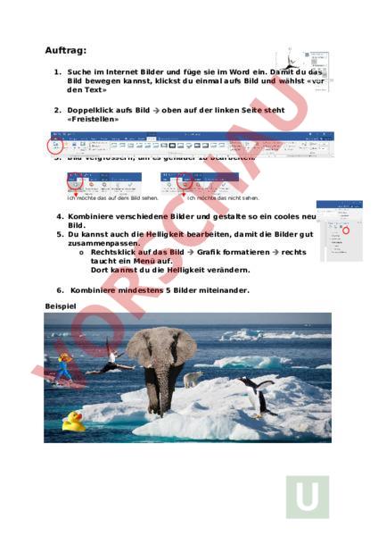 Auftrag: 1. Suche im Internet Bilder und füge sie im Word ein. Damit du das Bild bewegen kannst, klickst du einmal aufs Bild und wählst «vor den Text» 2. Doppelklick aufs Bild oben auf der linken Seite steht «Freistellen» 3. Bild vergrössern, um es genauer zu bearbeiten. ich möchte das auf dem Bild sehen. ich möchte das nicht sehen. 4. Kombiniere verschiedene Bilder und gestalte so ein cooles neues Bild. 5. Du kannst auch die Helligkeit bearbeiten, damit die Bilder gut zusammenpassen. Rechtsklick auf das Bild Grafik formatieren rechts taucht ein Menü auf. Dort kannst du die Helligkeit verändern. 6. Kombiniere mindestens 5 Bilder miteinander. Beispiel