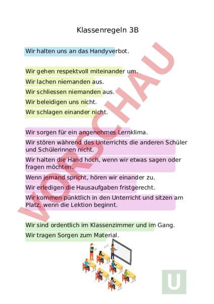 Klassenregeln 3B Wir halten uns an das Handyverbot. Wir gehen respektvoll miteinander um. Wir lachen niemanden aus. Wir schliessen niemanden aus. Wir beleidigen uns nicht. Wir schlagen einander nicht. Wir sorgen für ein angenehmes Lernklima. Wir stören während des Unterrichts die anderen Schüler und Schülerinnen nicht. Wir halten die Hand hoch, wenn wir etwas sagen oder fragen möchten. Wenn jemand spricht, hören wir einander zu. Wir erledigen die Hausaufgaben fristgerecht. Wir kommen pünktlich in den Unterricht und sitzen am Platz, wenn die Lektion beginnt. Wir sind ordentlich im Klassenzimmer und im Gang. Wir tragen Sorgen zum Material.