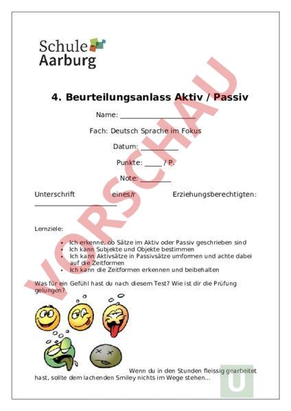 4. Beurteilungsanlass Aktiv Passiv Name: Fach: Deutsch Sprache im Fokus Datum: Punkte: P. Note: Unterschrift eines/r Erziehungsberechtigten: Lernziele: Ich erkenne, ob Sätze im Aktiv oder Passiv geschrieben sind Ich kann Subjekte und Objekte bestimmen Ich kann Aktivsätze in Passivsätze umformen und achte dabei auf die Zeitformen Ich kann die Zeitformen erkennen und beibehalten Was für ein Gefühl hast du nach diesem Test? Wie ist dir die Prüfung gelungen? Wenn du in den Stunden fleissig gearbeitet hast, sollte dem lachenden Smiley nichts im Wege stehen 1. Unterstreiche in folgendem Abschnitt die (Teil-)Sätze, die im Passiv stehen, grün. (3 P) Als die Schläuche endlich verlegt worden waren, konnte die Feuerwehr mit Atemschutzgeräten durch das Treppenhaus vorrücken. Erst nach etwa drei Stunden konnten die Männer das Feuer unter Kontrolle bringen. Enttäuscht stellte man fest, dass der ganze Dachstock zerstört wurde. Die Polizei gab später bekannt, dass der Brand höchstwahrscheinlich gelegt worden war. Setze die folgenden Sätze in das Passiv (10 P) Achte auf die korrekte Zeitform der Verben! 1. Der Hai griff den Schwimmer nicht an. 2. Daheim haben ihn seine Eltern ins Bett gesteckt. 3. Morgen wird mich sogar die Frau Direktor loben. 4. Kommissar Brandner entwaffnete den Attentäter sofort. 5. Sie hat eben die Tür geöffnet. Setze die folgenden Sätze in das Aktiv. (10 P) Achte auf die korrekte Zeitform der Verben! 1. Der Dieb wird vom Detektiv entlarvt. 2. Dieses Bild wurde von einem berühmten Künstler gemalt. 3. Im Winter werden die Vogel von der alten Dame gefüttert. 4. Dieses Blumenbeet wird von mir ganz allein gepflegt. 5. Von allen wurde dieser Bosewicht gefürchtet. 4. Kreuze die Zeitform und Aktiv/Passiv an! (P6) Passiv Aktiv Plusquamperfek Präteritum Perfekt Präsens Futur 2 a) Zum Transport ist ein Anhänger bereitgestellt worden. b) Im Zeltlager werden unsere Freunde besucht werden. c) Die Bahnverbindung wurde unterbrochen. d) Die Kinos werden geschlossen. e) Der Fährmann hatte das Schiff gesteuert. f) Die Angreifer wurden geschlagen. g) Die Unfälle werden zugenommen haben. h) Ein Schiff wird angelegt. i) Ein Schiff wird anlegen. j) Dem Chirurgen wurde vertraut. k) Aller guter Dinge sind drei. l) Möchtest du reich werden? Futur 1 Zu bestimmender Satz Bilde die geforderten Zeitformen von den folgenden Satzen! (9 P) 1. Präsens: Der Verletzte wird eingeliefert. Perfekt: Futur II: 2. Präteritum: Am Wochenende wurde er entlassen. Plusquamperfekt: Futur I: 3. Futur II: Die Katze wird geimpft worden sein. Präsens: Präteritum: Lösung: Unterstreiche in folgendem Abschnitt die (Teil-)Sätze, die im Passiv stehen, grün. (3 P) Als die Schläuche endlich verlegt worden waren, konnte die Feuerwehr mit Atemschutzgeräten durch das Treppenhaus vorrücken. Erst nach etwa drei Stunden konnten die Männer das Feuer unter Kontrolle bringen (1). Enttäuscht stellte man fest (2), dass der ganze Dachstock zerstört wurde. Die Polizei gab später bekannt, dass der Brand höchstwahrscheinlich gelegt worden war. Unterstreiche nun in obigem Abschnitt einen weiteren (Teil-)Satz, der zwar im Aktiv steht, wo das Passiv aber sinnvoll eingesetzt werden könnte, blau. Warum wäre deiner Meinung nach in diesem Satz ein Passiv sinnvoll? (2 P)(1) „die Männer ist unnötig und es ist klar, dass es sich um die Feuerwehr handelt. (2) „man ist schlechter Stil und ist unnötig. Setze die folgenden Sätze in das Passiv. Verschweige den Täter. (10 P) Achte auf die korrekte Zeitform der Verben! 1. Wir sollten vermehrt auf die Umwelt Rücksicht nehmen. Auf die Umwelt sollte vermehrt Rücksicht genommen werden. 2. An unserem Hochzeitstag regnete es in Strömen. - nicht möglich (regnen ist ein „intransitives Verb) 3. Der verantwortliche Mitarbeiter hat die Angelegenheit sofort erledigen müssen. Diese Angelegenheit musste sofort erledigt werden._ 4. Kommissar Brandner entwaffnete den Attentäter sofort.Der Attentäter wurde sofort entwaffnet. 5. Sie hat eben die Tür geöffnet.Die Tür ist eben geöffnet worden. Niveau B: 1. Unbekannte hatten die Bank am Bahnhofsplatz ausgeraubt.Die Bank am Bahnhofsplatz war ausgeraubt worden. 2. Vor dem Rennen striegelt der Stallknecht das Rennpferd Silberpfeil.Das Rennpferd Silberpfeil wird vor dem Rennen gestriegelt. 3. Alle lesen dieses spannende Buch gern. Dieses spannende Buch wird gern gelesen. Setze die folgenden Sätze in das Passiv. Nenne den Täter. (10 P) Achte auf die korrekte Zeitform der Verben! 1. Der Arzt wird den Patienten untersuchen.Der Patient wird vom Arzt untersucht werden. 2. Ein Golfball wird den unvorsichtigen Spaziergänger treffen.kann nicht umgeformt werden, da der Satz bereits im Passiv steht. 3. Der OK-Präsident hatte soeben die Expo eröffnet.Die Expo war soeben vom OK-Präsidenten eröffnet worden. 4. Der Mond erhellt die nächtliche Landschaft.Die nächtliche Landschaft wird durch den Mond erhellt. 5. Meine Schwester hat den ganzen Saal alleine putzen müssen.Der ganze Saal hat von meiner Schwester geputzt werden müssen. Niveau B: 1. Ein Stararchitekt hat dieses tolle Gebäude entworfen.Dieses tolle Gebäude ist von einem Stararchitekten entworfen worden. Meine Schwester hat den ganzen Saal alleine geputzt. Der ganze Saal ist von meiner Schwester alleine geputzt worden. Auch diesem Sturm werden die erfahrenen Matrosen trotzen können. Der ganze Vorfall wurde von der Polizei intensiv untersucht. Durch das Parlament ist das Thema noch nicht genug diskutiert worden. Ich werde in einer Woche eine wichtige Prüfung schreiben müssen. Morgen wird mein Onkel operiert werden. Sie wurde ganz grau im Gesicht. Niveau B: Markiere in folgenden Sätzen in den Kästchen hinter den Sätzen ob der Satz im Aktiv oder im Passiv steht. (6 P) Sie wurde ganz grau im Gesicht. Morgen wird mein Onkel operiert werden. Ich werde in einer Woche eine wichtige Prüfung schreiben müssen. Durch das Parlament ist das Thema noch nicht genug diskutiert wo