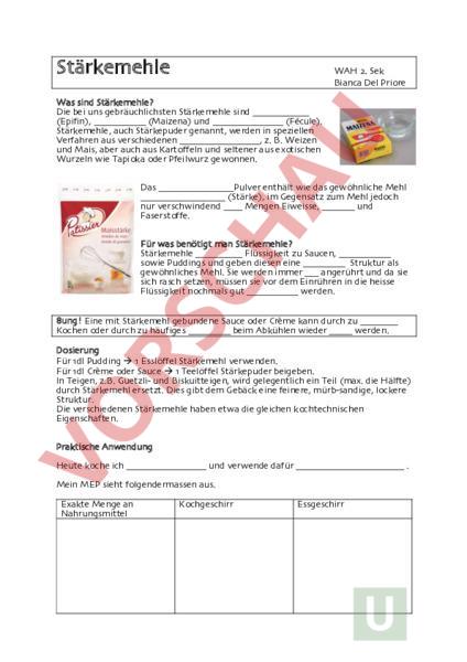 Stärkemehle WAH 2. Sek Bianca Del Priore Was sind Stärkemehle? Die bei uns gebräuchlichsten Stärkemehle sind (Epifin), (Maizena) und (Fécule). Stärkemehle, auch Stärkepuder genannt, werden in speziellen Verfahren aus verschiedenen, z. B. Weizen und Mais, aber auch aus Kartoffeln und seltener aus exotischen Wurzeln wie Tapioka oder Pfeilwurz gewonnen. Das Pulver enthält wie das gewöhnliche Mehl (Stärke), im Gegensatz zum Mehl jedoch nur verschwindend Mengen Eiweisse, und Faserstoffe. Für was benötigt man Stärkemehle? Stärkemehle Flüssigkeit zu Saucen, sowie Puddings und geben diesen eine Struktur als gewöhnliches Mehl. Sie werden immer angerührt und da sie sich rasch setzen, müssen sie vor dem Einrühren in die heisse Flüssigkeit nochmals gut werden. 8ung! Eine mit Stärkemehl gebundene Sauce oder Crème kann durch zu Kochen oder durch zu häufiges beim Abkühlen wieder werden. Dosierung Für 1dl Pudding à 1 Esslöffel Stärkemehl verwenden. Für 1dl Crème oder Sauce à 1 Teelöffel Stärkepuder beigeben. In Teigen, z.B. Guetzli- und Biskuitteigen, wird gelegentlich ein Teil (max. die Hälfte) durch Stärkemehl ersetzt. Dies gibt dem Gebäck eine feinere, mürb-sandige, lockere Struktur. Die verschiedenen Stärkemehle haben etwa die gleichen kochtechnischen Eigenschaften. Praktische Anwendung Heute koche ich und verwende dafür Mein MEP sieht folgendermassen aus. Exakte Menge an Nahrungsmittel Kochgeschirr Essgeschirr