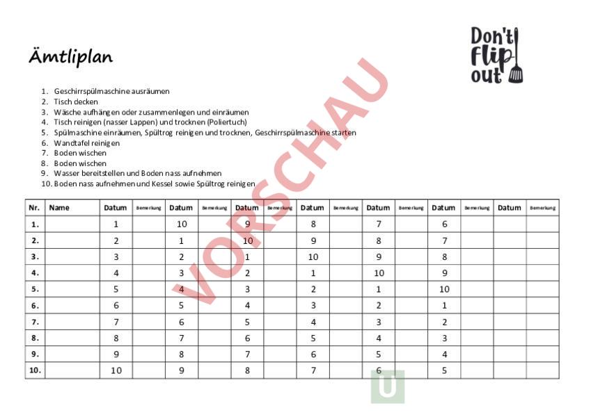 Ämtliplan 1. Geschirrspülmaschine ausräumen 2. Tisch decken 3. Wäsche aufhängen oder zusammenlegen und einräumen 4. Tisch reinigen (nasser Lappen) und trocknen (Poliertuch) 5. Spülmaschine einräumen, Spültrog reinigen und trocknen, Geschirrspülmaschine starten 6. Wandtafel reinigen 7. Boden wischen 8. Boden wischen 9. Wasser bereitstellen und Boden nass aufnehmen 10. Boden nass aufnehmen und Kessel sowie Spültrog reinigen Nr. Name Datum Bemerkung Datum Bemerkung Datum Bemerkung Datum Bemerkung Datum Bemerkung Datum 1. 1 10 9 8 7 6 2. 2 1 10 9 8 7 3. 3 2 1 10 9 8 4. 4 3 2 1 10 9 5. 5 4 3 2 1 10 6. 6 5 4 3 2 1 7. 7 6 5 4 3 2 8. 8 7 6 5 4 3 9. 9 8 7 6 5 4 10. 10 9 8 7 6 5 Bemerkung Datum Bemerkung