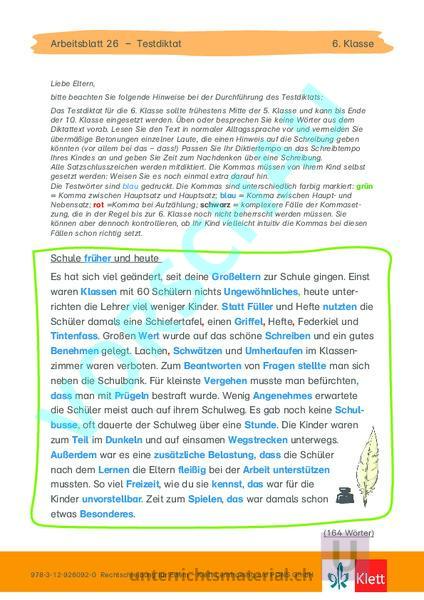 Arbeitsblatt 26 – Testdiktat 6. Klasse Liebe Eltern, bitte beachten Sie folgende Hinweise bei der Durchführung des Testdiktats: Das Testdiktat für die 6. Klasse sollte frühestens Mitte der 5. Klasse und kann bis Ende der 10. Klasse eingesetzt werden. Üben oder besprechen Sie keine Wörter aus dem Diktattext vorab. Lesen Sie den Text in normaler Alltagssprache vor und vermeiden Sie übermäßige Betonungen einzelner Laute, die einen Hinweis auf die Schreibung geben könnten (vor allem bei das – dass!) Passen Sie Ihr Diktiertempo an das Schreibtempo Ihres Kindes an und geben Sie Zeit zum Nachdenken über eine Schreibung. Alle Satzschlusszeichen werden mitdiktiert. Die Kommas müssen von Ihrem Kind selbst gesetzt werden: Weisen Sie es noch einmal extra darauf hin. Die Testwörter sind blau gedruckt. Die Kommas sind unterschiedlich farbig markiert: grün Komma zwischen Hauptsatz und Hauptsatz; blau Komma zwischen Haupt- und Nebensatz; rot Komma bei Aufzählung; schwarz komplexere Fälle der Kommasetzung, die in der Regel bis zur 6. Klasse noch nicht beherrscht werden müssen. Sie können aber dennoch kontrollieren, ob Ihr Kind vielleicht intuitiv die Kommas bei diesen Fällen schon richtig setzt. Schule früher und heute Es hat sich viel geändert, seit deine Großeltern zur Schule gingen. Einst waren Klassen mit 60 Schülern nichts Ungewöhnliches, heute unterrichten die Lehrer viel weniger Kinder. Statt Füller und Hefte nutzten die Schüler damals eine Schiefertafel, einen Griffel, Hefte, Federkiel und Tintenfass. Großen Wert wurde auf das schöne Schreiben und ein gutes Benehmen gelegt. Lachen, Schwätzen und Umherlaufen im Klassenzimmer waren verboten. Zum Beantworten von Fragen stellte man sich neben die Schulbank. Für kleinste Vergehen musste man befürchten, dass man mit Prügeln bestraft wurde. Wenig Angenehmes erwartete die Schüler meist auch auf ihrem Schulweg. Es gab noch keine Schulbusse, oft dauerte der Schulweg über eine Stunde. Die Kinder waren zum Teil im Dunkeln und auf einsamen Wegstrecken unterwegs. Außerdem war es eine zusätzliche Belastung, dass die Schüler nach dem Lernen die Eltern fleißig bei der Arbeit unterstützen mussten. So viel Freizeit, wie du sie kennst, das war für die Kinder unvorstellbar. Zeit zum Spielen, das war damals schon etwas Besonderes. (164 Wörter) 978-3-12-926092-0 Rechtschreibung für Eltern – Klett Lerntraining c/o PONS GmbH Auswertungsbogen Testdiktat – Arbeitsblatt 26 Rechtschreibphänomen Wörter mit Doppelkonsonanten Wörter mit tz und ck Wörter mit ss/ß Wörter mit Dehnungs-h Wörter mit silbentrennendem Testwörter mit Lupenstelle statt, Füller, Griffel, stellte, kennst, unvorstellbar nutzten, Schwätzen, Wegstrecken, zusätzlich, unterstützen Großeltern, Klassen, Tintenfass, Schulbusse, außerdem, fleißig Ungewöhnliches, Lehrer, Benehmen, Angenehmes 6. Klasse Anzahl korrekter Lupenstellen früher, Umherlaufen, Vergehen befürchten, dass Belastung, dass kennst, das Spielen, das Klassen, Wert, Fragen, Prügeln, Großschreibung von Stunde, Teil, Wegstrecken, Nomen Belastung, Arbeit, Freizeit Schreiben, Benehmen, Schwätzen, Großschreibung von Umherlaufen, Beantworten, Vergehen nominalisierten Verben Lernen, Spielen Großschreibung von no- Ungewöhnliches, Angenehmes, minalisierten Adjektiven Dunkeln, Besonderes Komma zwischen Hauptsatz und Ungewöhnliches, heute Hauptsatz Schulbusse, oft (grün markiert) Komma zwischen geändert, seit Haupt- und Nebensatz befürchten, dass (blau markiert) Belastung, dass Komma bei Lachen, Schwätzen Aufzählungen Schiefertafel, einen Griffel, Hefte, (rot markiert) Federkiel Schreibung von das/dass Bildquellennachweis Thinkstock, München (dedMazay) 978-3-12-926092-0 Rechtschreibung für Eltern – Klett Lerntraining c/o PONS GmbH von 6 von 5 von 6 von 4 von 3 von 4 von 10 von 8 von 4 von 2 von 3 von 4