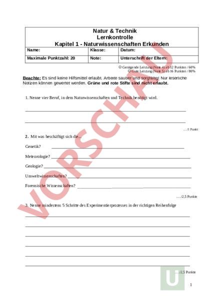 Natur Technik Lernkontrolle Kapitel 1 Naturwissenschaften Erkunden Name: Klasse: Datum: Maximale Punktzahl: 20 Note: Unterschrift der Eltern: Genügende Leistung (Note 4) ab 12 Punkten 60% Gute Leistung (Note 5) ab 16 Punkten 80% Beachte: Es sind keine Hilfsmittel erlaubt. Arbeite sauber und sorgfältig! Nur leserliche Notizen können gewertet werden. Grüne und rote Stifte sind nicht erlaubt. 1. Nenne vier Beruf, in dem Naturwissenschaften und Technik benötigt wird. ./1 Punkt 2. Mit was beschäftigt sich die. Genetik? Meteorologie? Geologie? Umweltwissenschaften? Forensische Wissenschaften? ./2,5 Punkte 3. Nenne mindestens 5 Schritte des Experimentierprozesses in der richtigen Reihenfolge ./2,5 Punkte 1 4. Welche Aussage stimmt? a) Experimente dienen dazu, Dinge zu beobachten und Hypothesen zu überprüfen. b) Eine Entdeckung wird absichtlich von Menschen geplant. c) Mikroskope sind nur für Ärzte wichtig. ./1 Punkt 5. Warum ist es wichtig, die Ergebnisse genau zu Protokolieren? ./1,5 Punkte 6. Ordne zu: Beobachtung Hypothese Schlussfolgerung a) Das Wasser verdampft beim Erhitzen. b) Ich vermute, dass Pflanzen schneller wachsen, wenn sie mehr Licht bekommen. c) Die Blätter der Pflanze sind grün. ./1,5 Punkte 7. Was ist der Unterschied zwischen einer Entdeckung und einer Erfindung? ./2 Punkte 2 8. Das Mikroskop a) Beschrifte die einzelnen Teile des Mikroskops ./2,5 Punkte b) Wie unterscheidet sich eine Lupe von einem Mikroskop? Schreibe drei Unterschiede auf. ./1,5 Punkte c) Wie heißen die 2 Gläser, zwischen die das Objekt eingeklemmt wird? ./1 Punkt 3 9. Lückentext: Die grünen Körner in Pflanzenzellen heißen und sind für die verantwortlich. ./1 Punkt 10. Vom Samen zur Pflanze: Setze die Schritte in die richtige Reihenfolge: Wurzeln wachsen Keimung Blätter entwickeln sich Samen nimmt Wasser auf ./2 Punkte 4