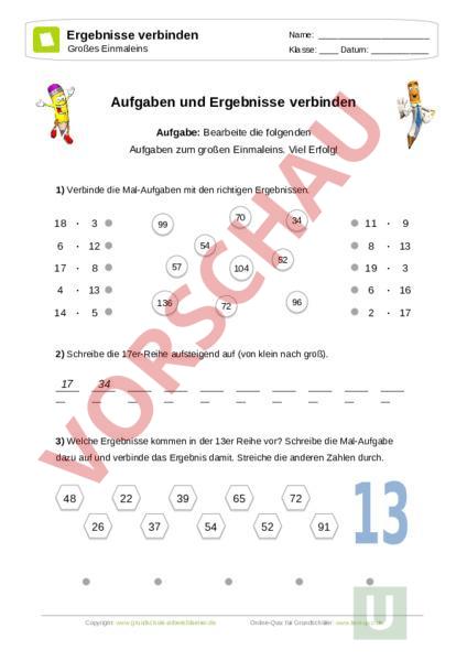 Ergebnisse verbinden Name: Großes Einmaleins Klasse: Datum: Aufgaben und Ergebnisse verbinden Aufgabe: Bearbeite die folgenden Aufgaben zum großen Einmaleins. Viel Erfolg! 1) Verbinde die Mal-Aufgaben mit den richtigen Ergebnissen. 18 6 3 70 99 12 17 4 34 11 8 54 57 8 52 104 14 136 5 96 72 13 19 13 9 3 6 16 2 17 2) Schreibe die 17er-Reihe aufsteigend auf (von klein nach groß). 17 34 3) Welche Ergebnisse kommen in der 13er Reihe vor? Schreibe die Mal-Aufgabe dazu auf und verbinde das Ergebnis damit. Streiche die anderen Zahlen durch. 48 22 26 39 37 65 54 Copyright: www.grundschule-arbeitsblaetter.de 72 52 91 Online-Quiz für Grundschüler: www.lern-quiz.de Ergebnisse verbinden Name: Großes Einmaleins Klasse: Datum: Copyright: www.grundschule-arbeitsblaetter.de Online-Quiz für Grundschüler: www.lern-quiz.de