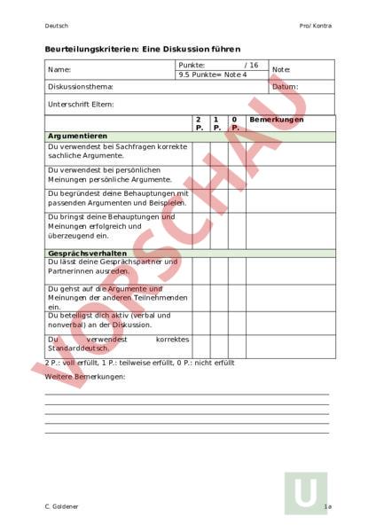Deutsch Pro/ Kontra Beurteilungskriterien: Eine Diskussion führen Punkte: 16 9.5 Punkte Note 4 Name: Note: Datum: Diskussionsthema: Unterschrift Eltern: 2 P. 1 P. 0 P. Bemerkungen Argumentieren Du verwendest bei Sachfragen korrekte sachliche Argumente. Du verwendest bei persönlichen Meinungen persönliche Argumente. Du begründest deine Behauptungen mit passenden Argumenten und Beispielen. Du bringst deine Behauptungen und Meinungen erfolgreich und überzeugend ein. Gesprächsverhalten Du lässt deine Gesprächspartner und Partnerinnen ausreden. Du gehst auf die Argumente und Meinungen der anderen Teilnehmenden ein. Du beteiligst dich aktiv (verbal und nonverbal) an der Diskussion. Du verwendest Standarddeutsch. korrektes 2 P.: voll erfüllt, 1 P.: teilweise erfüllt, 0 P.: nicht erfüllt Weitere Bemerkungen: C. Goldener 1a