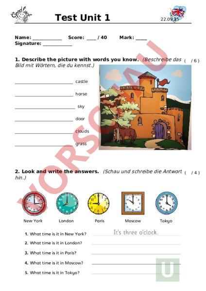 Test Unit 1 Name: Score: 40 Signature: 22.09.25 Mark: 1. Describe the picture with words you know. (Beschreibe das Bild mit Wörtern, die du kennst.) /6) castle horse sky door clouds grass 2. Look and write the answers. (Schau und schreibe die Antworten /4) hin.) 3. Translate. (Übersetze.) German /6) English ein Berg speak Italian. hellgrün Ich komme aus Frankreich. the sky dark blue 4. Read and correct. Write the text on the lines. (Lies und korrigiere. Schreibe den Text auf die Linien.) /6) dear emily, my name is sally. im eight and from australia. there are kangaroos in australia. do you like kangaroos? speak english. see you soon, sally Dear , 5. Read and tick () the correct picture. (Lies und machen einen /6) Haken beim richtigen Bild.) 1 There is house on the hill next to the forest. 2 There are clouds in the sky. 3 There is an old castle next to the lake. 4 There are lot of beautiful mountains in my country. 6. Listen and circle. (Hör zu und kreise ein.) /5) 7. Listen and number. (Hör zu und nummeriere.) /5) 5 My school is next to long road. 6 Look! Can you see the horse on the hill? 5 8. Complete the sentences. Choose and write the correct word /5) from the box. (Ergänze die Sätze. Wähle und schreibe das richtige Wort aus der Box in die Lücke.)