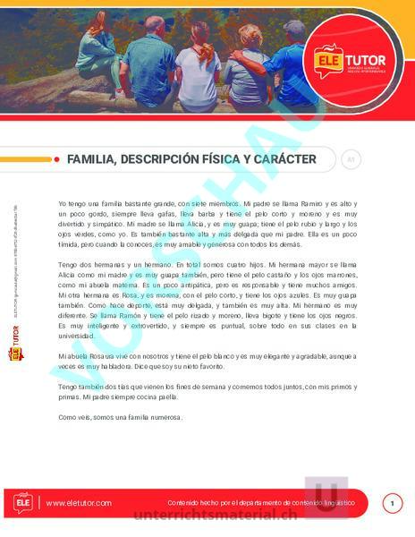 UN NUEVO LENGUAJE NUEVAS OPORTUNIDADES ELETUTOR 678be752df26dba6ec0a1f8b FAMILIA, DESCRIPCIÓN FÍSICA CARÁCTER A1 Yo tengo una familia bastante grande, con siete miembros. Mi padre se llama Ramiro es alto un poco gordo, siempre lleva gafas, lleva barba tiene el pelo corto moreno es muy divertido simpático. Mi madre se llama Alicia, es muy guapa; tiene el pelo rubio largo los ojos verdes, como yo. Es también bastante alta más delgada que mi padre. Ella es un poco tímida, pero cuando la conoces, es muy amable generosa con todos los demás. Tengo dos hermanas un hermano. En total somos cuatro hijos. Mi hermana mayor se llama Alicia como mi madre es muy guapa también, pero tiene el pelo castaño los ojos marrones, como mi abuela materna. Es un poco antipática, pero es responsable tiene muchos amigos. Mi otra hermana es Rosa, es morena, con el pelo corto, tiene los ojos azules. Es muy guapa también. Como hace deporte, está muy delgada, también es muy alta. Mi hermano es muy diferente. Se llama Ramón tiene el pelo rizado moreno, lleva bigote tiene los ojos negros. Es muy inteligente extrovertido, siempre es puntual, sobre todo en sus clases en la universidad. Mi abuela Rosaura vive con nosotros tiene el pelo blanco es muy elegante agradable, aunque veces es muy habladora. Dice que soy su nieto favorito. Tengo también dos tías que vienen los fines de semana comemos todos juntos, con mis primos primas. Mi padre siempre cocina paella. Como veis, somos una familia numerosa. www.eletutor.com Contenido hecho por el departamento de contenido lingüístico 1 ELETUTOR 678be752df26dba6ec0a1f8b Vocabulario Pelo largo corto rizado liso Responsable Pelo moreno rubio castaño blanco Introvertido/a Ojos verdes marrones negros azules Extrovertido/a Gafas Elegante Barba Bigote Alto/a Simpático/a Gordo/a Antipático/a Delgado/a Agradable Guapo/a Amable Feo/a Inteligente Hermano/a Divertido/a Padre Madre Hablador/a Abuelo/a Callado/a Primo/a Tímido/a Tío/a Puntual Nieto/a www.eletutor.com Contenido hecho por el departamento de contenido lingüístico 2 Completar Diálogos Diálogo 1 Mi hermana Pepa es muy. ELETUTOR 678be752df26dba6ec0a1f8b Yo también tengo una hermana, pero ella sí es Mide 1,80 cm. Diálogo 2 Mi madre es muy . Mi madre también, además es muy . Diálogo 3 Mi hermana Adela es muy . ¿Cómo tiene el pelo? (moreno). Diálogo 4 Pepa, ¿cómo es tu abuela de carácter? Es una persona muy . www.eletutor.com Contenido hecho por el departamento de contenido lingüístico 3 Hablar Sobre. En España casi todas las personas son morenas tienen los ojos marrones azules, no son muy altos. ¿Cómo son las personas físicamente en el lugar donde tú vives? En España la gente es bastante simpática extrovertida, también muy habladora. ¿Cómo es el ELETUTOR 678be752df26dba6ec0a1f8b carácter de la mayoría de la gente de tu país? Preguntas Diálogos Tienes que imaginar que quieres hacer una solicitud una agencia de modelos para anuncios de televisión. Haz un diálogo con tu profesor/a compañero/a, responde las siguientes expresiones. ¿Cómo te llamas? ¿Cuál/Cualés es/son tu(s) apellido(s)? ¿A qué te dedicas? ¿Cuántos años tienes? ¿Cuál es tu nacionalidad? ¿Cómo tienes el pelo? ¿De qué color tienes los ojos? ¿Cómo eres físicamente? ¿Cómo es tu carácter? www.eletutor.com Contenido hecho por el departamento de contenido lingüístico 4 Expresiones Comunes 1. Familia numerosa Ana, ¿cuántos miembros tiene tu familia? Es una familia numerosa, somos seis miembros. ELETUTOR 678be752df26dba6ec0a1f8b 2. Familia monoparental Mi amiga Ana vive sola con su padre. Ah, yo también vivo en una familia monoparental, con mi madre. 3. Familia multiétnica Mi compañera Alicia tiene una familia multiétnica. ¿De dónde son sus padres? Su padre es polaco su madre es argentina. Qué interesante. 4. Hijo/a único/a Yo tengo dos hermanos, ¿y tú? Yo no tengo hermanos. Soy hija única. www.eletutor.com Contenido hecho por el departamento de contenido lingüístico 5 Expresar gustos ¿Qué tipo de personas te gustan más físicamente? ¿Y de carácter? ¿Te gustan tus compañeros de clase de oficina? Menciona dos tres cosas que te gustan de alguno de ellos. Me gustan mucho las personas rubias con ojos azules porque en mi cultura son todos ELETUTOR 678be752df26dba6ec0a1f8b morenos con los ojos negros. Yo prefiero las mujeres morenas con ojos azules. prefiero las personas simpáticas inteligentes, porque me gusta mucho hablar. El que más me gusta es Rafa, un colega de mi oficina. Es alto rubio, es muy responsable generoso, siempre quiere ayudar los otros colegas. siempre es puntual. Funciones Relaciona las dos columnas para conectar la pregunta expresión con la función que la representa. PREGUNTAS/ EXPRESIONES FUNCIONES 1. ¿Cuántos miembros tiene tu familia? a. Preguntar por el tipo de familia. 2. ¿Cómo es tu familia? b. Peguntar por la descripción del pelo. 3. ¿Cómo eres físicamente? c. Preguntar por el color de los ojos. 4. ¿Cómo tiene el pelo tu padre? d. Preguntar por la descripción física. 5. ¿De qué color son tus ojos? e. Preguntar por la cantidad de personas que tiene una familia. 6. ¿Cuántos hermanos tienes? f. Preguntar por el carácter de una persona. 7. ¿Cómo es tu carácter? g. Preguntar por la cantidad de hermanos. www.eletutor.com Contenido hecho por el departamento de contenido lingüístico 6 Presentación Oral Haz una presentación personal sobre tu familia. Puedes hablar de los siguientes puntos: cuántos miembros hay en tu familia, qué tipo de familia es, cómo se llama cada miembro, cuántos años tienen, cuáles son su profesiones, cómo son físicamente, cómo es su carácter, qué te gusta de tu ELETUTOR 678be752df26dba6ec0a1f8b familia. www.eletutor.com Contenido hecho por el departamento de contenido lingüístico 7