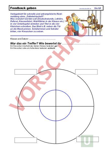 Feedback geben deutschunddeutlich.de Div10f Vorlageblatt für schnelle und unkomplizierte Rückmeldung ohne „Zettelwirtschaft. Was evaluiert werden soll (Deutschstunde, Lektüre, Referat, Klassenfahrt, Wohlfühlen in der Klasse etc.) in vier Unterkapitel einteilen und Titel in die vier Kästchen schreiben. Das Blatt z.B. neben die Tür an die Wand pinnen. Schülerinnen und Schüler bitten, vier Kreuzchen zu setzen. Klasse und Datum: War das ein Treffer? Wie bewertet ihr Ein Kreuzchen innerhalb des kleinen Kreises bedeutet: gut Ein Kreuzchen nahe am Außenkreis bedeutet: schlecht .
