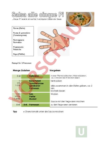 „Cinque Pi bezieht sich auf die 5 wichtigsten Zutaten der Sauce. Panna (Rahm) Purea di pomodoro (Tomatenpüree) Parmiggiano Parmesan Prezzemolo Petersilie Pepe (Pfeffer) Rezept für 3 Personen Menge Zutaten 3 dl Vorgehen Halbrahm in einer Pfanne aufkochen, Hitze reduzieren, ca. 5 Minuten leicht köcheln lassen 2 EL 1-2 EL Bund Peterli Tomatenpüree geriebener Parmesan feinhacken KL wenig Salz Pfeffer Muskat Würzen 1 Msp. alles zusammen in den Rahm geben, ca. 2 Min. köcheln lassen Sauce mit den Teigwaren mischen Evtl. Tipp Evtl. Parmesan zu den Teigwaren servieren • Cherrytomätli unter die Sauce mischen