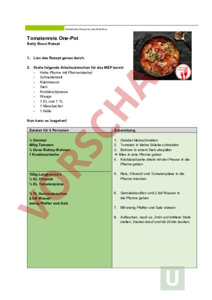 Didaktisiertes Rezept aus dem Betty Bossi Tomatenreis One-Pot Betty Bossi Rezept 1. Lies das Rezept genau durch. 2. Stelle folgende Arbeitsutensilien für das MEP bereit: Hohe Pfanne mit Pfannendeckel Schneidebrett Rüstmesser Sieb Knoblauchpresse Waage 1 EL und 1 TL 1 Massbecher 1 Kelle Nun kann es losgehen! Zutaten für 2 Personen Zubereitung Zwiebel 400g Tomaten Dose Kidney-Bohnen 1 Knoblauchzehe 1. Zwiebel kleinschneiden 2. Tomaten in kleine Stücke schneiden 3. Bohnen in einem Sieb abspülen à Alles in eine Pfanne geben 4. Knoblauchzehe direkt mit der Presse in die Pfanne geben 150g Langkornreis EL Olivenöl EL Tomatenpüree 5. Reis, Olivenöl und Tomatenpüree in die Pfanne mischen. TL Gemüsebouillon 2.5dl Wasser wenig Pfeffer und Salz 6. Gemüsebouillon und 2.5dl Wasser in die Pfanne geben 7. Mit wenig Pfeffer und Salz würzen 8. Aufkochen, nach ca. 2min auf mittlere Stufe stellen, Deckel drauf und für 20min kochen.
