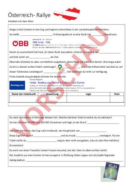 Österreich- Rallye Arbeiten mit dem Atlas Steige in Bad Gastein in den Zug und beginne deine Reise in der Landeshauptstadt Kärntens. Sie heißt: ; lt Atlasangebe ist es eine Stadt mit Einwohnern. Damit du ausreichend Zeit hast, dir diese Stadt anzusehen, nimmst du den Zug um und bist somit um am Ziel. Alternativ könntest du aber von Mallnitz ausgehend, deine Reise mit dem Rad starten. Wie lange wärst du bis zu diesem ersten Zielort unterwegs? Wie viele Höhenmeter würdest du auf dieser Teilstrecke zurücklegen? Viel Geld hast du nicht zur Verfügung. Finde deshalb das günstigste Zimmer für eine Nacht: Name der Unterkunft Bewertung Lage Preis Du setzt deine Reise in Richtung Westen fort. Welche Kärntner Stadt erreichst du als nächstes? Sie hat zwischen 50 000 und 100 000 Einwohner und liegt an der Drau? Von dort nimmst du den Zug nach Innsbruck, der Hauptstadt von. Diese Zugfahrt dauert und du musst umsteigen. Für ein Ticket zahlst du , vergiss aber nicht anzugeben, dass du dein Rad mitführst. (Screenshot) Du wirst von einer Freundin/ einem Freund erwartet, bei der/ dem du übernachten darfst. Der Ausblick aus dem Fenster ist hervorragend. In Richtung Osten zeigen sich die Gipfel folgender Gebirgsketten: Als nächstes möchtest du gerne eine Nacht am Bodensee verbringen. Welche österreichische Stadt bietet sich dafür an? . Sie ist die Hauptstadt von Den Bodensee versuchst du am folgenden Tag mit dem Rad zu umrunden. Du startest in Richtung Norden. Du solltest unbedingt einen Ausweis mitnehmen, weil du neben Österreich auch folgende Länder durchquerst:; Allerdings geht dir in Konstanz die Puste aus. Bis dorthin hast du aber bereits km zurückgelegt. Du nimmst die Fähre zurück zum Ausgangspunkt und bezahlst Euro dafür. Die Reise geht weiter in die Landeshauptstadt deines Bundeslandes. Weil du vor 15:00 Uhr dort ankommen möchtest, bietet sich welche Verbindung dafür an?. Leider regnet es am nächsten Tag. Deshalb entscheidest du dich für folgende 3 Sehenswürdigkeiten: Deine Reise geht weiter nach Passau (D). Du durchquerst dabei folgende Viertel Oberösterreichs: Über diese Stadt kannst du folgende Informationen finden: Außerdem kommen hier 3 Flüsse zusammen, nämlich: . Nun möchtest du unbedingt die älteste Stadt Österreichs besuchen: , sie wird auch liebevoll die Stadt der bezeichnet und liegt ebenfalls an 2 Flüssen: ; Schade ist, dass du keine Zeit hast, die 3 größten Städte Oberösterreichs zu besichtigen. Liste sie trotzdem hier der Größe nach geordnet auf: Auch für Niederösterreich bleibt dir nicht viel Zeit. Von den Vierteln entscheidest du dich, ins zu fahren und machst eine Schifffahrt von Melk nach Krems. Dabei legst du Kilometer zurück. Du übernachtest in Gars am Kamp, weil Als nächstes Ziel würde sich Wien anbieten. Dafür braucht man aber viel Zeit, außerdem wirst du die Bundeshauptstadt mit der Schule besuchen. Deshalb fährst du direkt weiter ins östlichste Bundesland Österreichs:; Nur dersee trennt dich hier vom Nachbarland . Mit einer Länge von und einer Breite von ist es der größte See Österreichs. Außerdem weist er folgendes Kennzeichen auf: Nun wird es Zeit für das letzte Ziel dieser Reise. Es fehlt nur noch die, sie wird auch Mark bezeichnet, weil . Du steigst in Eisenstadt in den Zug, kommst am Hausberg der Wiener vorbei, dem und passierst folgende Gemeinden des letzten Bundeslandes: bis du die Landeshauptstadt erreichst. Sie ist mit Einwohnern die größte Stadt Österreichs. Beschreibe kurz ihre geografische Lage: . Außerdem liegt diese Stadt an der (Fluss). Würdest du nun noch weiter in Richtung Süden fahren, kämst du an die Grenze. Dorthin fehlen nur noch Kilometer. Trotzdem entscheidest du dich, deine Reise zu beenden und ins schöne Gasteinertal zurückzukehren. Welche Möglichkeiten des öffentlichen Verkehrs stehen dir zur Verfügung? Welches ist die günstigste Variante? Welches die schnellste? Du hast es geschafft! Du bist wieder zuhause!