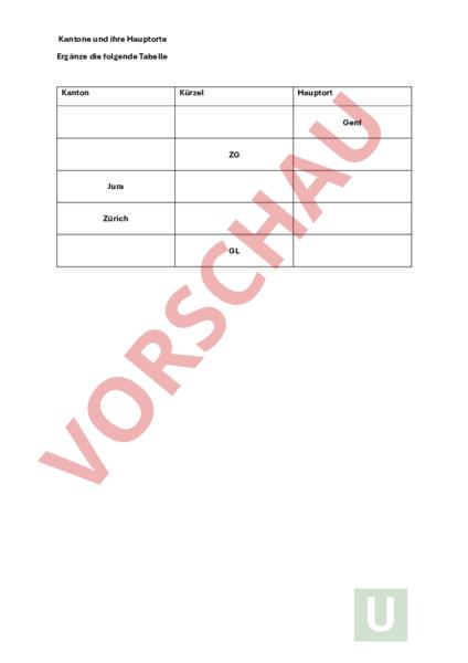 Kantone und ihre Hauptorte Ergänze die folgende Tabelle Kanton Kürzel Hauptort Genf ZG Jura Zürich GL