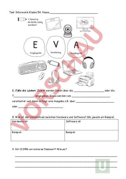 Test Informatik Klasse 5A Name: 2. Fülle die Lücken: Zuerst werden Daten über die oder die T_ eingegeben. Diese werden vom verarbeitet und dannn erfolgt eine Ausgabe z.B. über oder 3. Was ist der Unterschied zwischen Hardware und Software? Gib jeweils ein Beispiel. Hardware ist Software ist Beispiel: Beispiel: 4. Ist 123456 ein sicheres Passwort? Warum?