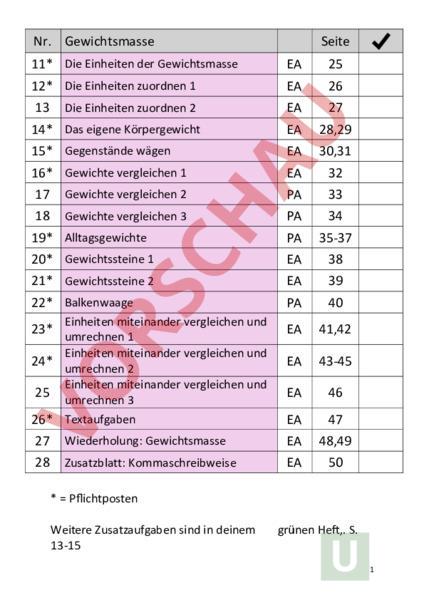 Nr. Gewichtsmasse Seite 11* Die Einheiten der Gewichtsmasse EA 25 12* Die Einheiten zuordnen 1 EA 26 13 EA 27 14* Das eigene Körpergewicht EA 28,29 15* Gegenstände wägen EA 30,31 16* Gewichte vergleichen 1 EA 32 17 Gewichte vergleichen 2 PA 33 18 Gewichte vergleichen 3 PA 34 19* Alltagsgewichte PA 35-37 20* Gewichtssteine 1 EA 38 21* Gewichtssteine 2 EA 39 22* Balkenwaage PA 40 EA 41,42 EA 43-45 EA 46 EA 47 Die Einheiten zuordnen 2 Einheiten miteinander vergleichen und umrechnen 1 Einheiten miteinander vergleichen und 24* umrechnen 2 Einheiten miteinander vergleichen und 25 umrechnen 3 26* Textaufgaben 23* 27 Wiederholung: Gewichtsmasse EA 48,49 28 Zusatzblatt: Kommaschreibweise EA 50 Pflichtposten Weitere Zusatzaufgaben sind in deinem 13-15 grünen HeZ,. S. 1