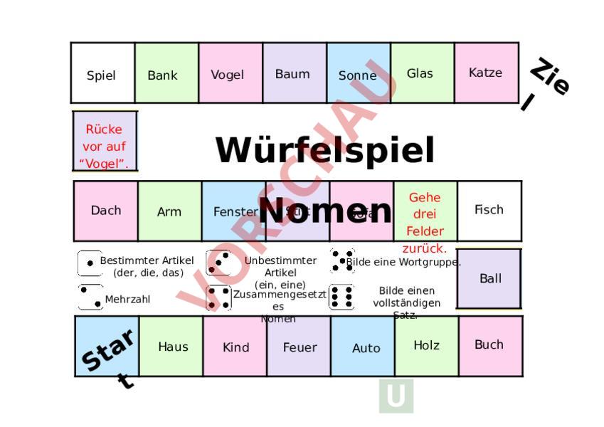 Spiel Bank Baum Vogel Sonne Glas Katze Rücke vor auf Vogel. Dach Würfelspiel Arm Bestimmter Artikel (der, die, das) Mehrzahl a S Haus Nomen Fenster Stift Unbestimmter Artikel (ein, eine) Zusammengesetzt es Nomen Kind Feuer Sofa Gehe drei Felder zurück. Fisch Bilde eine Wortgruppe. Bilde einen vollständigen Satz. Auto Holz Ball Buch Zi
