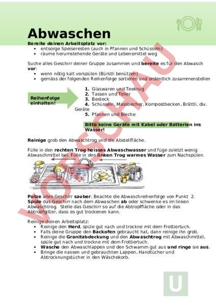 Abwaschen Bereite deinen Arbeitsplatz vor: entsorge Speiseresten (auch in Pfannen und Schüsseln) räume herumstehende Geräte und Lebensmittel weg Suche alles Geschirr deiner Gruppe zusammen und bereite es für den Abwasch vor: wenn nötig kalt vorspülen (Bürstli benützen) gemäss der folgenden Reihenfolge sortieren und ordentlich zusammenstellen Reihenfolge einhalten! 1. 2. 3. 4. Geräte 5. Glaswaren und Teekrug Tassen und Teller Besteck Schüsseln, Massbecher, Kompostbecken, Brättli, div. Pfannen und Bleche Bitte keine Geräte mit Kabel oder Batterien ins Wasser! Reinige grob den Abwaschtrog und die Abstellfläche. Fülle in den rechten Trog heisses Abwaschwasser und füge zuletzt wenig Abwaschmittel bei. Fülle in den linken Trog warmes Wasser zum Nachspülen. Putze alles Geschirr sauber. Beachte die Abwaschreihenfolge von Punkt 2. Spüle das Geschirr nach dem Abwaschen ab oder schwenke es im linken Abwaschtrog. Stelle das Geschirr so auf die Abtropffläche oder in das Abtropfgitter, dass es gut trockenen kann. Reinige deinen Arbeitsplatz: Reinige den Herd, spüle gut nach und trockne mit dem Frottiertuch. Falls deine Gruppe den Backofen gebraucht hat, dann reinige ihn grob. Reinige die Granitabdeckung und den Abwaschtrog mit Abwaschmittel, spüle gut nach und trockne mit dem Frottiertuch. Wasche den Abwaschlappen und den Schwamm gut aus und ringe sie aus. Bringe die nassen und gebrauchten Lappen, Handtücher und Abtrocknungstücher in den Wäschekorb.