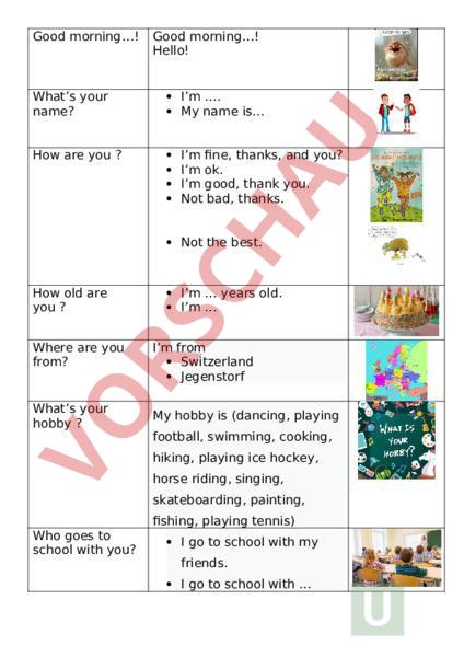 Good morning! Good morning! Hello! Whats your name? Im . My name is How are you Im fine, thanks, and you? Im ok. Im good, thank you. Not bad, thanks. Not the best. How old are you Where are you from? Whats your hobby Im years old. Im Im from Switzerland Jegenstorf My hobby is (dancing, playing football, swimming, cooking, hiking, playing ice hockey, horse riding, singing, skateboarding, painting, fishing, playing tennis) Who goes to school with you? go to school with my friends. go to school with Whats the date today Its the th of (January, February, March, April, May, June, July, August, September, October, November, December) What day is it today? Its (Monday, Tuesday, Wednesday, Thursday, Friday, Saturday, Sunday)