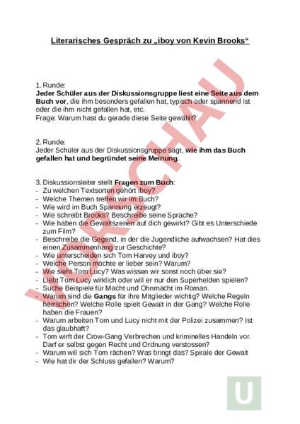 Literarisches Gespräch zu „iboy von Kevin Brooks 1. Runde: Jeder Schüler aus der Diskussionsgruppe liest eine Seite aus dem Buch vor, die ihm besonders gefallen hat, typisch oder spannend ist oder die ihm nicht gefallen hat, etc. Frage: Warum hast du gerade diese Seite gewählt? 2. Runde: Jeder Schüler aus der Diskussionsgruppe sagt, wie ihm das Buch gefallen hat und begründet seine Meinung. 3. Diskussionsleiter stellt Fragen zum Buch: Zu welchen Textsorten gehört iboy? Welche Themen treffen wir im Buch? Wie wird im Buch Spannung erzeugt? Wie schreibt Brooks? Beschreibe seine Sprache? Wie haben die Gewaltszenen auf dich gewirkt? Gibt es Unterschiede zum Film? Beschreibe die Gegend, in der die Jugendliche aufwachsen? Hat dies einen Zusammenhang zur Geschichte? Wie unterscheiden sich Tom Harvey und iboy? Welche Person möchte er lieber sein? Warum? Wie sieht Tom Lucy? Was wissen wir sonst noch über sie? Liebt Tom Lucy wirklich oder will er nur den Superhelden spielen? Suche Beispiele für Macht und Ohnmacht im Roman. Warum sind die Gangs für ihre Mitglieder wichtig? Welche Regeln herrschen? Welche Rolle spielt Gewalt in der Gang? Welche Rolle haben die Frauen? Warum arbeiten Tom und Lucy nicht mit der Polizei zusammen? Ist das glaubhaft? Tom wirft der Crow-Gang Verbrechen und kriminelles Handeln vor. Darf er selbst gegen Recht und Ordnung verstossen? Warum will sich Tom rächen? Was bringt das? Spirale der Gewalt Wie hat dir der Schluss gefallen? Warum?