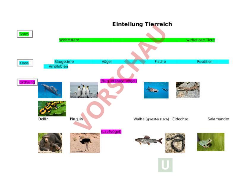 Einteilung Tierreich Stam Wirbeltiere Säugetiere Amphibien Klass wirbellose Tiere Vögel Fische Reptilien (flugunfähige Vögel) Ordnung Delfin Pinguin Walhai(grösster Fisch) Eidechse (Laufvögel) Salamander Schimpanse Strauss Forelle Kreuzotter (Hühnervögel) Kangaroo Huhn Hai Schildkröte Bergmolch rosch