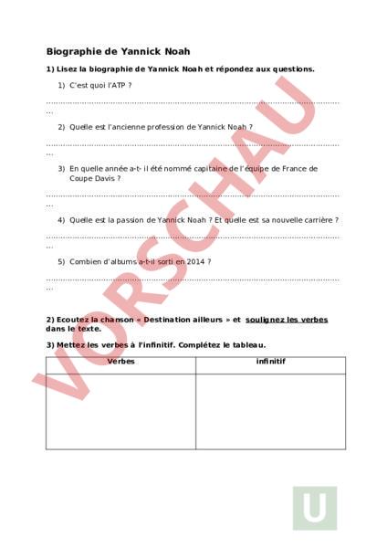 Biographie de Yannick Noah 1) Lisez la biographie de Yannick Noah et répondez aux questions. 1) Cest quoi lATP 2) Quelle est lancienne profession de Yannick Noah 3) En quelle année a-t- il été nommé capitaine de léquipe de France de Coupe Davis 4) Quelle est la passion de Yannick Noah Et quelle est sa nouvelle carrière 5) Combien dalbums a-t-il sorti en 2014 2) Ecoutez la chanson « Destination ailleurs » et soulignez les verbes dans le texte. 3) Mettez les verbes à linfinitif. Complétez le tableau. Verbes infinitif
