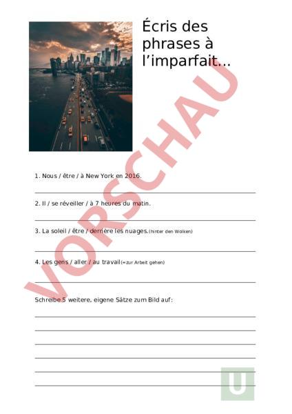 Écris des phrases à limparfait. 1. Nous être à New York en 2016. 2. Il se réveiller à 7 heures du matin. 3. La soleil être derrière les nuages.(hinter den Wolken) 4. Les gens aller au travail(zur Arbeit gehen) Schreibe 5 weitere, eigene Sätze zum Bild auf: