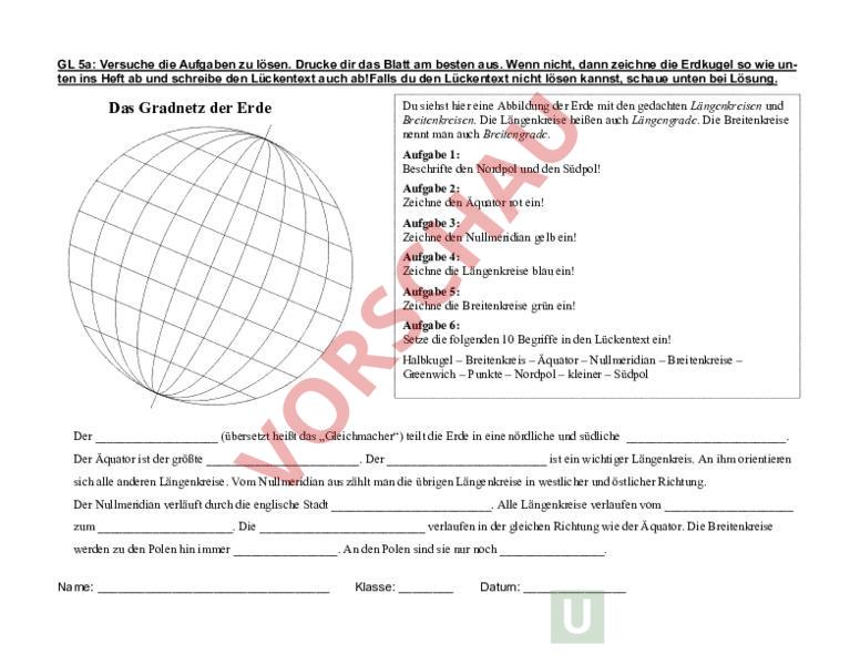 GL 5a: Versuche die Aufgaben zu lösen. Drucke dir das Blatt am besten aus. Wenn nicht, dann zeichne die Erdkugel so wie unten ins Heft ab und schreibe den Lückentext auch ab!Falls du den Lückentext nicht lösen kannst, schaue unten bei Lösung. Das Gradnetz der Erde Du siehst hier eine Abbildung der Erde mit den gedachten Längenkreisen und Breitenkreisen. Die Längenkreise heißen auch Längengrade. Die Breitenkreise nennt man auch Breitengrade. Aufgabe 1: Beschrifte den Nordpol und den Südpol! Aufgabe 2: Zeichne den Äquator rot ein! Aufgabe 3: Zeichne den Nullmeridian gelb ein! Aufgabe 4: Zeichne die Längenkreise blau ein! Aufgabe 5: Zeichne die Breitenkreise grün ein! Aufgabe 6: Setze die folgenden 10 Begriffe in den Lückentext ein! Halbkugel – Breitenkreis – Äquator – Nullmeridian – Breitenkreise – Greenwich – Punkte – Nordpol – kleiner – Südpol Der (übersetzt heißt das „Gleichmacher) teilt die Erde in eine nördliche und südliche . Der Äquator ist der größte. Der ist ein wichtiger Längenkreis. An ihm orientieren sich alle anderen Längenkreise. Vom Nullmeridian aus zählt man die übrigen Längenkreise in westlicher und östlicher Richtung. Der Nullmeridian verläuft durch die englische Stadt . Alle Längenkreise verlaufen vom zum . Die verlaufen in der gleichen Richtung wie der Äquator. Die Breitenkreise werden zu den Polen hin immer. An den Polen sind sie nur noch. Name: Klasse: Datum: GL 5a: Versuche die Aufgaben zu lösen. Drucke dir das Blatt am besten aus. Wenn nicht, dann zeichne die Erdkugel so wie unten ins Heft ab und schreibe den Lückentext auch ab!Falls du den Lückentext nicht lösen kannst, schaue unten bei Lösung. Das Gradnetz der Erde (LÖSUNGEN) Du siehst hier eine Abbildung der Erde mit den gedachten Längenkreisen und Breitenkreisen. Die Längenkreise heißen auch Längengrade. Die Breitenkreise nennt man auch Breitengrade. Aufgabe 1: Beschrifte den Nordpol und den Südpol! Aufgabe 2: Zeichne den Äquator rot ein! Aufgabe 3: Zeichne den Nullmeridian gelb ein! Aufgabe 4: Zeichne die Längenkreise blau ein! Aufgabe 5: Zeichne die Breitenkreise grün ein! Aufgabe 6: Setze die folgenden 10 Begriffe in den Lückentext ein! Halbkugel – Breitenkreis – Äquator – Nullmeridian – Breitenkreise – Greenwich – Punkte – Nordpol – kleiner – Südpol DerÄquator_ (übersetzt heißt das „Gleichmacher) teilt die Erde in eine nördliche und südlicheHalbkugel. Der Äquator ist der größteBreitenkreis. DerNullmeridian_ ist ein wichtiger Längenkreis. An ihm orientieren sich alle anderen Längenkreise. Vom Nullmeridian aus zählt man die übrigen Längenkreise in westlicher und östlicher Richtung. Der Nullmeridian verläuft durch die englische StadtGreenwich. Alle Längenkreise verlaufen vomNordpol_ zumSüdpol_. DieBreitenkreise_ verlaufen in der gleichen Richtung wie der Äquator. Die Breitenkreise werden zu den Polen hin immerkleiner_. An den Polen sind sie nur nochPunkte. Name: Klasse: Datum: