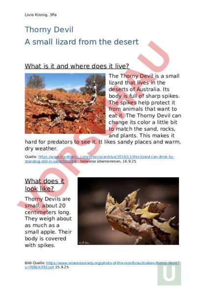 Livio Kronig, 3Pa Thorny Devil small lizard from the desert What is it and where does it live? The Thorny Devil is small lizard that lives in the deserts of Australia. Its body is full of sharp spikes. The spikes help protect it from animals that want to eat it. The Thorny Devil can change its color little bit to match the sand, rocks, and plants. This makes it hard for predators to see it. It likes sandy places and warm, dry weather. Quelle: teilweise übernommen, 16.9.25 What does it look like? Thorny Devils are small, about 20 centimeters long. They weigh about as much as small apple. Their body is covered with spikes. Bild-Quelle: vf69b47f43ce4 15.9.25 Livio Kronig, 3Pa What does it eat? Thorny Devils eat only ants. They wait near ant trails and catch the ants with their sticky tongue. They can eat thousands of ants every day. They also get water from the ants and from rain or dew. How does it get water? Thorny Devils have small grooves on their skin. When it rains or there is dew on the ground, the water goes into these grooves and runs to the lizards mouth. They can even get water from wet sand by just standing on it. This helps them survive in the dry desert. Quelle: srsltidAfmBOopkLBPIVgJjCJRBpy-wWaJmNM8npN5P9jN564tZFZPaZyWkJM, teilweise übernommen, 15.9.25 How does it protect itself? The Thorny Devil uses its spikes and color to stay safe. Sometimes it freezes or moves very slowly to confuse predators. All these tricks make it very hard for predators to catch the Thorny Devil. Quellen: teilweise übernommen, 15.9.25 Did you know? The Thorny Devil has fake head on its back. When predator comes, it hides its real head and shows the fake head. This confuses the predator and helps the lizard stay safe. Livio Kronig, 3Pa Quelle: teilweise übernommen, 15.9.25