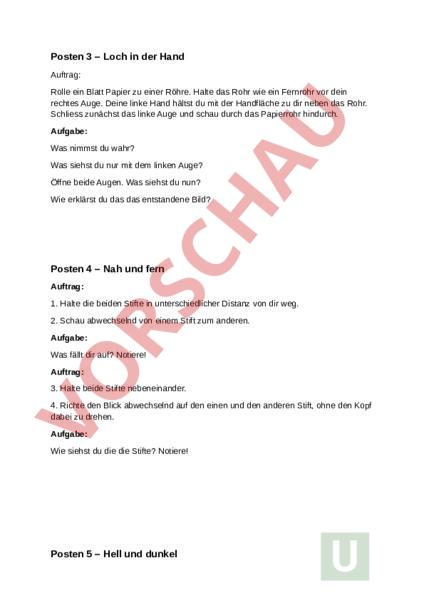 Posten 3 – Loch in der Hand Auftrag: Rolle ein Blatt Papier zu einer Röhre. Halte das Rohr wie ein Fernrohr vor dein rechtes Auge. Deine linke Hand hältst du mit der Handfläche zu dir neben das Rohr. Schliess zunächst das linke Auge und schau durch das Papierrohr hindurch. Aufgabe: Was nimmst du wahr? Was siehst du nur mit dem linken Auge? Öffne beide Augen. Was siehst du nun? Wie erklärst du das das entstandene Bild? Posten 4 – Nah und fern Auftrag: 1. Halte die beiden Stifte in unterschiedlicher Distanz von dir weg. 2. Schau abwechselnd von einem Stift zum anderen. Aufgabe: Was fällt dir auf? Notiere! Auftrag: 3. Halte beide Stifte nebeneinander. 4. Richte den Blick abwechselnd auf den einen und den anderen Stift, ohne den Kopf dabei zu drehen. Aufgabe: Wie siehst du die die Stifte? Notiere! Posten 5 – Hell und dunkel Auftrag: Jemand von euch hält sich mit der Hand etwa eine Minute lang ein Auge zu. Richte nun den Blick zu der anderen Person und entferne rasch die Hand. Der Partner, die Partnerin vergleicht nun die beiden Pupillen miteinander. Aufgabe: Was fällt dir auf? Beschreibe die Beobachtung und erklärt sie. Posten 6 – Bunter Text Auftrag: Legt fest, ob es darum geht, die Farben so schnell wie möglich aufzuzählen oder das geschriebene Wort. Spielt 2-3 Runden. Versucht es dann auch noch auf englisch. Aufgabe: Was ist euch aufgefallen? Notiert! Posten 8 – Optische Täuschung Auftrag: Schaut euch das magische Buch an und auch die Karten. Probiert aus! Posten 1 – Auge Auftrag: Schaut euch den Kurzfilm und das Modell an und füllt das Arbeitsblatt aus. Posten 2 – Ohr Auftrag: Informiere dich dazu auf der folgenden Webseiten Link: Aufgabe: Fülle mit den Informationen von den Webseiten die Textfelder in der Zeichnung aus. Posten 7 – Sei ganz Ohr! Auftrag: 1. Wenn du dir eine grosse Muschel an dein Ohr hältst, hörst du das Meer rauschen?! Oder nicht? Wieso ist das so? 2. Sprecht miteinander über das Schnurtelefon. Achtet darauf, dass die Schnur ganz gestreckt ist, sonst funktioniert es nicht. 3. Das Gabelexperiment Binde die Schnur um eine Gabel. Wickle die Schnurenden um deine Zeigefinger. Stosse mit der Gabel gegen etwas Hartes, zum Beispiel ein Stuhlbein oder einen Stein. Stecke dir nun die Zeigefinger in die Ohren. Denke daran, die Schnurenden sind noch immer um die Finger gewickelt. Bücke dich etwas nach vorne, so dass die Gabel frei schwingen kann. Stosse erneut mit der Gabel gegen einen harten Gegenstand. Was hörst du jetzt? Tönt, als wärst du direkt unter einem Kirchenturm? Aufgabe: 1. Was steckt dahinter? Hört man wirklich das Meer rauschen? Oder was hört man? 2. Schnurtelefon: Wieso kann man sich trotz Distanz hören? 3. Gabelexperiment: Was hört man da? Notiert!