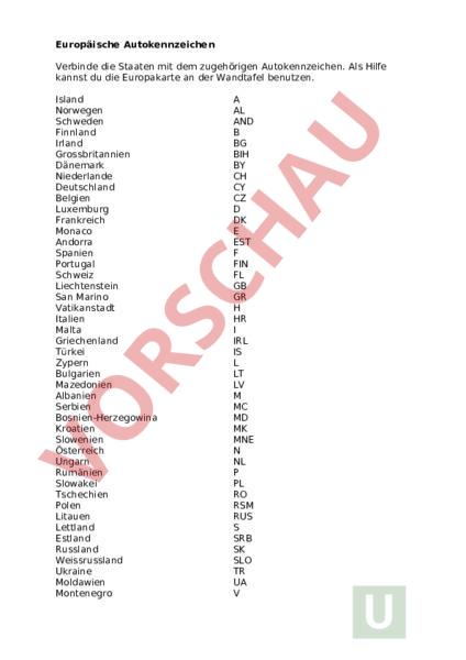 Arbeitsblatt: Autokennzeichen Europa