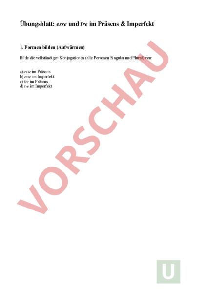 Übungsblatt: esse und īre im Präsens Imperfekt 1. Formen bilden (Aufwärmen) Bilde die vollständigen Konjugationen (alle Personen Singular und Plural) von: a) esse im Präsens b) esse im Imperfekt c) īre im Präsens d) īre im Imperfekt 2. Formen erkennen Bestimme Person, Numerus, Tempus von folgenden Formen (Vorsicht, Falle): 1. est 2. erant 3. īmus 4. ībant 5. es 6. ītis 7. eram 8. īre 3. Übersetze ins Lateinische (Zusatzaufgabe) Übersetze die Sätze ins Lateinische (achte auf Präsens oder Imperfekt!): 1. Ich bin hier. 2. Wir waren Freunde. 3. Die Mädchen gehen in die Stadt. 4. Ihr wart oft im Theater. 5. Er geht in die Schule. 6. Sie gingen schnell nach Hause. 4. Kleine Sätze ins Deutsche Übersetze die folgenden lateinischen Sätze ins Deutsche: 1. Discipuli in scholā sunt. 2. Amici ad forum eunt. 3. Puellae in hortō erant. 4. Servus in domum ibat. 5. Nox erat. 5. Mini-Text ergänzen Fülle die Lücken mit den richtigen Formen von esse oder īre: Text: Puerī in viā (esse, Präsens). Subitō magister venit. Quō (īre, Präsens)? inquit. Ad forum (īre, Präsens)! respondent puerī. Postrīdiē puerī iterum in viā (esse, Imperfekt). Sed magister in scholā (esse, Imperfekt). Lösungen zu den Aufgaben zu esse īre 1. Formen bilden a) esse Präsens sum – es – est – sumus – estis – sunt b) esse Imperfekt eram – erās – erat – erāmus – erātis – erant c) īre Präsens eō – īs – it – īmus – ītis – eunt d) īre Imperfekt ībam – ībās – ībat – ībāmus – ībātis – ībant 2. Formen erkennen 1. est – 3. Sg. Präsens esse 2. erant – 3. Pl. Imperfekt esse 3. īmus – 1. Pl. Präsens īre 4. ībant – 3. Pl. Imperfekt īre 5. es – 2. Sg. Präsens esse 6. ītis – 2. Pl. Präsens īre 7. eram – 1. Sg. Imperfekt esse 8. īre – In nitiv Präsens īre fi 3. Übersetze ins Lateinische 1. Ich bin hier. Hic sum. 2. Wir waren Freunde. Amīcī erāmus. 3. Die Mädchen gehen in die Stadt. Puellae in urbem eunt. 4. Ihr wart oft im Theater. Saepe in theātrō erātis. 5. Er geht in die Schule. Ad scholam it. 6. Sie gingen schnell nach Hause. Celeriter domum ībant. 4. Kleine Sätze ins Deutsche 1. Discipuli in scholā sunt. Die Schüler sind in der Schule. 2. Amici ad forum eunt. Die Freunde gehen zum Forum. 3. Puellae in hortō erant. Die Mädchen waren im Garten. 4. Servus in domum ibat. Der Sklave ging ins Haus. 5. Nox erat. Es war Nacht. 5. Mini-Text ergänzen Lösungstext: Puerī in viā sunt. Subitō magister venit. Quō ītis? inquit. Ad forum īmus! respondent puerī. Postrīdiē puerī iterum in viā erant. Sed magister in scholā erat.