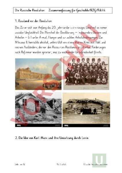 Die Russische Revolution – Zusammenfassung für Geschichte/RZG/Politik 1. Russland vor der Revolution Das Zarenreich war Anfang des 20. Jahrhunderts ein riesiges Land mit ex sozialer Ungleichheit. Die Mehrheit der Bevölkerung – insbesondere Bauern und Arbeiter – litt unter Armut, Hunger und schlechten Arbeitsbedingungen. Nikolaus II. herrschte solut, ab unterstützt von einem kleinen Kreis aus Adel un reichen Ausländern, die von den Ressourcen Russlands profitierten. For nach Reformen wurden ignoriert, was zu wachsender Unzufriedenheit 2. Die Idee von Karl Marx und ihre Umsetzung durch Lenin Seite1 von12 16.10.2025 AB zu den Russischen Revolutionen Die Russische Revolution – Zusammenfassung für Geschichte/RZG/Politik Karl Marx entwickelte das Konzept einer klassenlose Gesellschaft, in der das Eigentum an Produktionsmit allen gemeinsam gehört. Arbeiter sollten die Macht übernehmen und Ausbeutung beenden (Kommunism Lenin griff diese Ideen auf und forderte, eine kleine, dass entschlossene Gruppe (die Bolschewiki) die Führung übernehmen und eine sozialistische Revolution ßen ansto müsse. Sein Versprechen: „Frieden, Land, Brot – für Soldaten, Bauern und Arbeiter. Video -Tipp: 3. Die Bevölkerung, der Zar, die Aristokratie und wohlhabende Ausländ • Bevölkerung: Massiver Frust wegen Armut, Hunger und Kriegsnöten; Arbeiter und Bauern hofften auf Veränderung. • Zar: Zar Nikolaus II. blieb autoritär und glaubte an das Gottgegebe Recht zu herrschen. Er war abgeschottet vom Leid der Menschen. • Aristokratie: Der Adel und wohlhabende Ausländer (z.B. französische Unternehmer in der Industrie) profitierten vom alten System, wollt teilweise Reformen, um die eigene Macht zu sichern. Seite2 von12 16.10.2025 AB zu den Russischen Revolutionen Die Russische Revolution – Zusammenfassung für Geschichte/RZG/Politik 4. Der Erste Weltkrieg und seine Folgen Russland erlitt schwere Verluste. Die Versorgungslage verschlechterte dramatisch: Viele Soldaten starben, es herrschte Hunger. Die Regierung Durchhalten im Krieg, was zu Soldatenmeutereien und Protesten führte entlud sich in Februarrevolution der 1917: Zar Nikolaus II. musste abdanken Video -Tipp:Die Russischen Revolutionen erklärt (ab Minute 3:00) 5. Die Februar und Oktoberrevolution Nach der Abdankung des Zaren übernahm eine provisorische Regierung setzte den Krieg aber fort. Lenin und die Bolschewiki nutzten die Kriegsm Seite3 von12 16.10.2025 AB zu den Russischen Revolutionen Die Russische Revolution – Zusammenfassung für Geschichte/RZG/Politik Im Oktober 1917 (nach gregorianischem Kalender November) stürzten Regierung. Bekannt ist der „Sturm auf den Winterpalast, der oft drama dargestellt wurde als er tatsächlich ablief: Tatsächlich war der Widersta und viele historisc he Fotos oder Filme zeigen Inszenierungen. wikipedia 1youtube Bildhinweis: Legendäres Symbolbild: Der Sturm auf den Winterpalast – das Bild wurde später nachgestellt und ist eigentlich keine Originalaufnahme! srf 6. Reaktionen der anderen Kriegsmächte Die westlichen Alliierten (z.B. ßbritannien, Gro Frankreich, USA) waren misstrauisch gegen über Lenin und den Bolschewiki, da sie den Krieg mit Deutschland beendeten und einen radikalen Kommunismus ührten. Deshalb einf unterst ützten sieäter sp Gegner der Bolschewiki ürgerkrieg im (die Wei ßen), ohne durchschlagenden Erfolg zu erzielen. 7. Folgen der Revolution • Russland wird zur sozialistischen Sowjetunion (UdSSR). • Adel und Gro ßbourgeoisie verlieren ihren Besitz, viele fliehen oder we enteignet. • Die sozialistische Planwirtschaft wird eingeführt, auch für ausländis Unternehmen ein Problem. • Gesellschaftliche Kontrolle, staatliche Gewalt und ein Einparteiensy bestimmen das politische Leben. Museums -Tipp:Das Schweizerische Landesmuseum bietet Objekte, Bilder Führungen speziell für Schülerinnen und Schüler PDF-Angebot an. für den Unterricht landesmuseum Seite4 von12 16.10.2025 AB zu den Russischen Revolutionen Die Russische Revolution – Zusammenfassung für Geschichte/RZG/Politik Passende Aufgaben für Geschichte (RZG) 1. Einstellung zur Revolution: Stell dich in die Lage eines Bauern, einer Adligen oder eines Arbeite hättest du damals zur Revolution gestanden? Schreibe fünf Sätze Sicht. 2. Marx und Lenin vergleichen: Erkläre in eigenen Worten, was Marx und was Lenins Vorstellung Revolution war. Was war gleich, was war anders? 3. Karikatur oder Bildanalyse: Suche dir ein Bild (z.B. vom Sturm auf den Winterpalast oder dem Zarismus) und beschreibe, was darauf zu sehen ist und warum es fü Russische Revolution wichtig ist. Bilder zum Download für Unterricht gettyimages 4. Video Reflexion: Schaue ein Erklärvideo zur Russischen Revolution EinfachSchule, 4 ).Min Notiere die drei wichtigsten Erkenntnisse aus dem Video und beurt das Video die Ereignisse bewertet. youtube Seite5 von12 16.10.2025 AB zu den Russischen Revolutionen Die Russische Revolution – Zusammenfassung für Geschichte/RZG/Politik Seite6 von12 16.10.2025 AB zu den Russischen Revolutionen Die Russische Revolution – Zusammenfassung für Geschichte/RZG/Politik Seite7 von12 16.10.2025 AB zu den Russischen Revolutionen Die Russische Revolution – Zusammenfassung für Geschichte/RZG/Politik Seite8 von12 16.10.2025 AB zu den Russischen Revolutionen Die Russische Revolution – Zusammenfassung für Geschichte/RZG/Politik Seite9 von12 16.10.2025 AB zu den Russischen Revolutionen Die Russische Revolution – Zusammenfassung für Geschichte/RZG/Politik Seite10 von12 16.10.2025 AB zu den Russischen Revolutionen Die Russische Revolution – Zusammenfassung für Geschichte/RZG/Politik Seite11von12 16.10.2025 AB zu den Russischen Revolutionen Die Russische Revolution – Zusammenfassung für Geschichte/RZG/Politik Seite12 von12 16.10.2025 AB zu den Russischen Revolutionen