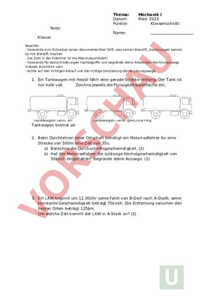 Thema: Datum: Punkte: Mechanik März 2023 Klassenschnitt: Note: Name: Klasse: Beachte: Verwende zum Schreiben einen dokumentechten Stift, also keinen Bleistift, Zeichnungen kannst du mit Bleistift machen. Die Zahl in der Klammer ist die Maximalpunktzahl. Verwende für deine Erklärungen Fachbegriffe und begründe deine Antworten. Rechnungswege müssen ersichtlich sein. Achte auf den richtigen Ablauf und die richtige Darstellung deiner Lösungswege. 1. Ein Tankwagen mit Heizöl fährt eine gerade Strecke entlang. Der Tank ist nur halb voll. Zeichne jeweils die Flüssigkeitsoberfläche ein. Tankwagen fährt an Tankwagen bremst ab Tankwagen fährt gleichförmig 2. Beim Durchfahren einer Ortschaft benötigt ein Motorradfahrer für eine Strecke von 500m eine Zeit von 35s. a) Berechne die Durchschnittsgeschwindigkeit. (2) b) Hat der Motorradfahrer die zulässige Höchstgeschwindigkeit von 50km/h eingehalten? Begründe deine Aussage. (1) 3. Ein LKW beginnt um 12.30Uhr seine Fahrt von B-Dorf nach A-Stadt; seine konstante Geschwindigkeit beträgt 75km/h. Die Entfernung zwischen den beiden Orten beträgt 125km. Um welche Zeit kommt der LKW in A-Stadt an? (2) 4. Ein Flugzeug verlässt Kloten um 13.45 Uhr und erreicht Rom um 15.09 Uhr. Es fliegt mit einer durchschnittlichen Geschwindigkeit von 510 km/h. Wie viele Kilometer sind es von Kloten nach Rom? (3) 5. Für eine längere Fahrt mit dem Auto rechnet ein Fahrer mit einer durchschnittlichen Geschwindigkeit von 60km/h. Nachdem er genau die Hälfte der Strecke zurückgelegt hat, stellt er fest, dass er durch Verkehrsbehinderungen durchschnittlich nur 30km/h gefahren ist. Kann er den Zeitverlust in der 2. Hälfte wieder aufholen? Begründe deine Aussage. (1) 6. Ein altes Motorrad fährt an und hat nach 3 Sekunden eine Geschwindigkeit von 10m/s. Danach fährt es mit gleichbleibender Geschwindigkeit für 3 Sekunden. a) Wenn der Fahrer danach kein Gas mehr gibt, sondern das Motorrad einfach ausrollen lässt wird es langsamer. Weshalb wird es wieder langsamer? Der Fahrer gebremst ja nicht! (1) b) Zeichne das Weg-Zeit-Diagramm zu dieser Aufgabe. (2) Strecke [m] 50 40 30 20 10 0 0 1 2 3 4 5 6 7 8 9 Zeit [s] c) Wie weit ist das Motorrad insgesamt gefahren? (1) 7. Wenn du einen Schlitten ziehst, musst du Kraft aufwenden. Nenne zwei Faktoren, von denen dein Kraftaufwand abhängig ist. (1) 8. Der Körper eines Astronauten hat auf der Erde eine Masse von 80 kg. Berechne seine Gewichtskraft auf der Erde und auf dem Mond. (2) 9. Stelle die folgenden Kräfte (zeichnerisch) mit Pfeilen dar. (1 1 cm) Eine Lampe zieht mit 4 nach unten, die Verankerung in der Decke hält dagegen. Zeichne die wirkenden Kräfte am rechten Rand dieser Seite. (1) 10.Ordne die folgenden Aussagen den richtigen Grafiken zu. (1.5) 1. Ein Heissluftballon steigt. Die Auftriebskraft ist grösser als die Gewichtskraft. 2. Ein Heissluftballon schwebt, weil die Auftriebskraft gleich gross ist wie die Gewichtskraft. 3. Ein Heissluftballon sinkt, weil die Gewichtskraft grösser geworden ist als die Auftriebskraft. 11.Welche der folgenden Aussagen sind richtig? Die Gewichtskraft existiert nur auf der Erde. Die Gewichtskraft existiert immer. Die Gewichtskraft eines Körpers ist auf der Erde und dem Mond gleich gross. Die Gewichtskraft kann mit der Federwaage bestimmt werden. 12.Wie gross ist die angehängte Masse bei Kraftmesser, wenn du die Messungen auf der Erde, respektive dem Mond durchführst? 1 Strich bedeutet auf der Erde 1N, siehe Abbildung. (1.5) FG Erde Kraftmesser FG Mond Masse