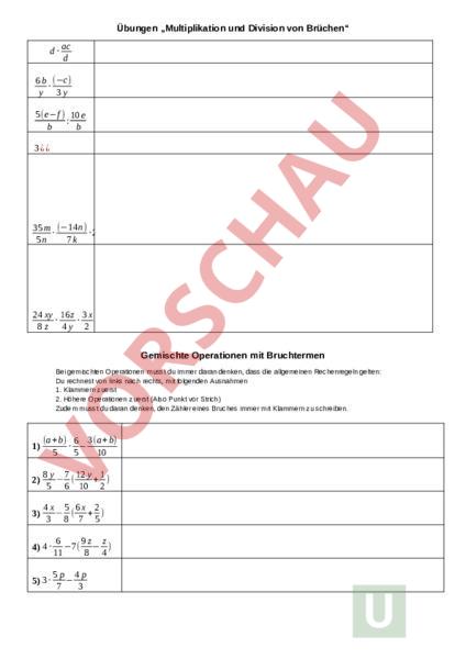 Übungen „Multiplikation und Division von Brüchen d ac 6 (c) 3y 5(ef 10 : b 3¿¿ 35 (14 n) 2 5n 7k 24 xy 16 3 8z 4 2 Gemischte Operationen mit Bruchtermen Bei gemischten Operationen musst du immer daran denken, dass die allgemeinen Rechenregeln gelten: Du rechnest von links nach rechts, mit folgenden Ausnahmen 1. Klammern zuerst 2. Höhere Operationen zuerst (Also Punkt vor Strich) Zudem musst du daran denken, den Zähler eines Bruches immer mit Klammern zu schreiben. 1) (a b) 6 3(a b) 5 5 10 2) 8 7 12 1 5 6 10 2 3) 4x 5 6x 2 3 8 7 5 4) 4 6 9z 7( 11 8 4 5) 3 5p 4p 7 3 6) 5r 7 3r 1 4 6 9 8 2
