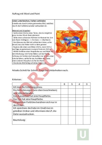 Auftrag mit Word und Paint Linien unterbrechen, Farben verbinden Erstelle ein durch Linien getrenntes Bild, welches durch die Farbtöne wieder verbunden ist. Material und Vorgehen: Suche einen Umriss eines Tieres, den du möglichst gross in einer Word-Datei platzierst Ziehe einen schwarzen Rahmen im Abstand bis 1cm vom Rand «Einfügen» - «Formen» - «Rechteck» Durchkreuze das Bild mit zahlreichen Linien, achte darauf, dass die Felder nicht zu klein geraten Kopiere alle Linien und Bilder (Ctrla, dann Ctrlc) und füge sie gemeinsam in einem Paint ein (Ctrlv) Wähle Farbtöne einer Hauptfarbe aus und klicke mit dem Werkzeug «mit Farbe füllen» auf die Fläche, Achtung: ein Farbton darf denselben nur in max. einer Ecke berühren, wähle für das Ausfüllen des Tieres einen anderen Hauptton als für den Rand Drucke das Bild farbig auf dickes Papier aus Arbeite Schritt für Schritt. Frage bei Unklarheiten nach. Kriterien: 6 Ich lese die Anleitung genau. Die Anforderungen (wie oben beschrieben) sind alle vorhanden. Das Aussenfeld hat eine Hauptfarbe. Das Tier hat eine Hauptfarbe. Die gleichen Farbtöne berühren sich nur in den Ecken. Ich speichere die Datei im OneDrive im geteilten Ordner und informiere die LP, die Datei auszudrucken. Beurteilung: 5 4 3