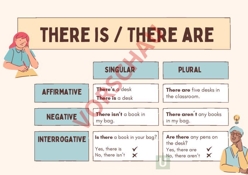 there is There are singular affirmative negative interrogative Theres desk plural There is desk There are five desks in the classroom. There isnt book in my bag. There arent any books in my bag. Is there book in your bag? Are there any pens on the desk? Yes, there are No, there arent Yes, there is No, there isnt